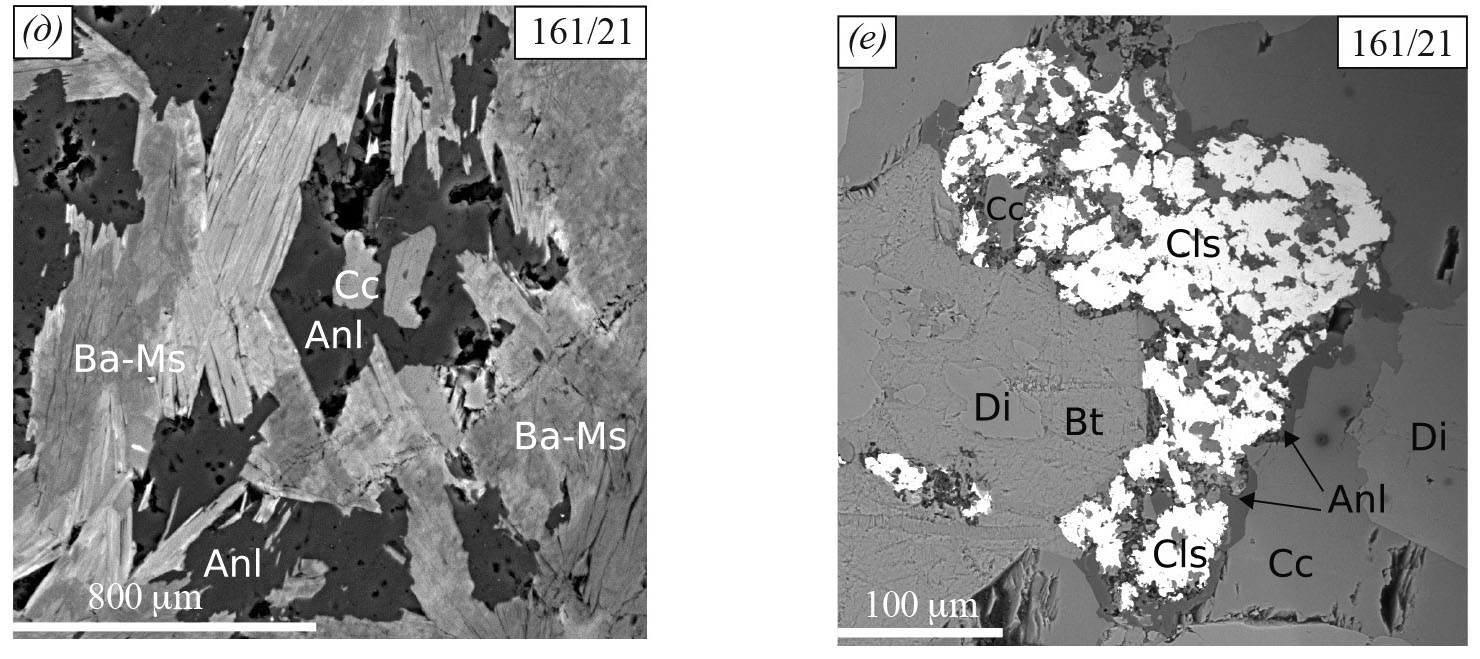 В образце ийолита 161/21 срастания Ва-содержащего мусковита с анальцимом (табл. 1) и кальцитом слагают лейкократовые обособления размером до (5‒7) — (10‒12) мм среди диопсида, являющиеся, вероятно, продуктом замещения канкринита. Центральная часть обособлений сложена вышеописанной ассоциацией, а в краевой зоне, на контакте с диопсидом, к ней добавляется цельзиан (рис. 2, г). В промежутках между зернами диопсида наблюдаются скопления цельзиана с анальцимом и кальцитом (рис. 2, е), иногда в них присутствует в небольшом количестве Ва-содержащий мусковит. В зернах слюды на BSE-изображениях проявлена зональность в виде светлых каемок, характеризующихся высоким содержанием Ва (рис. 2, д).