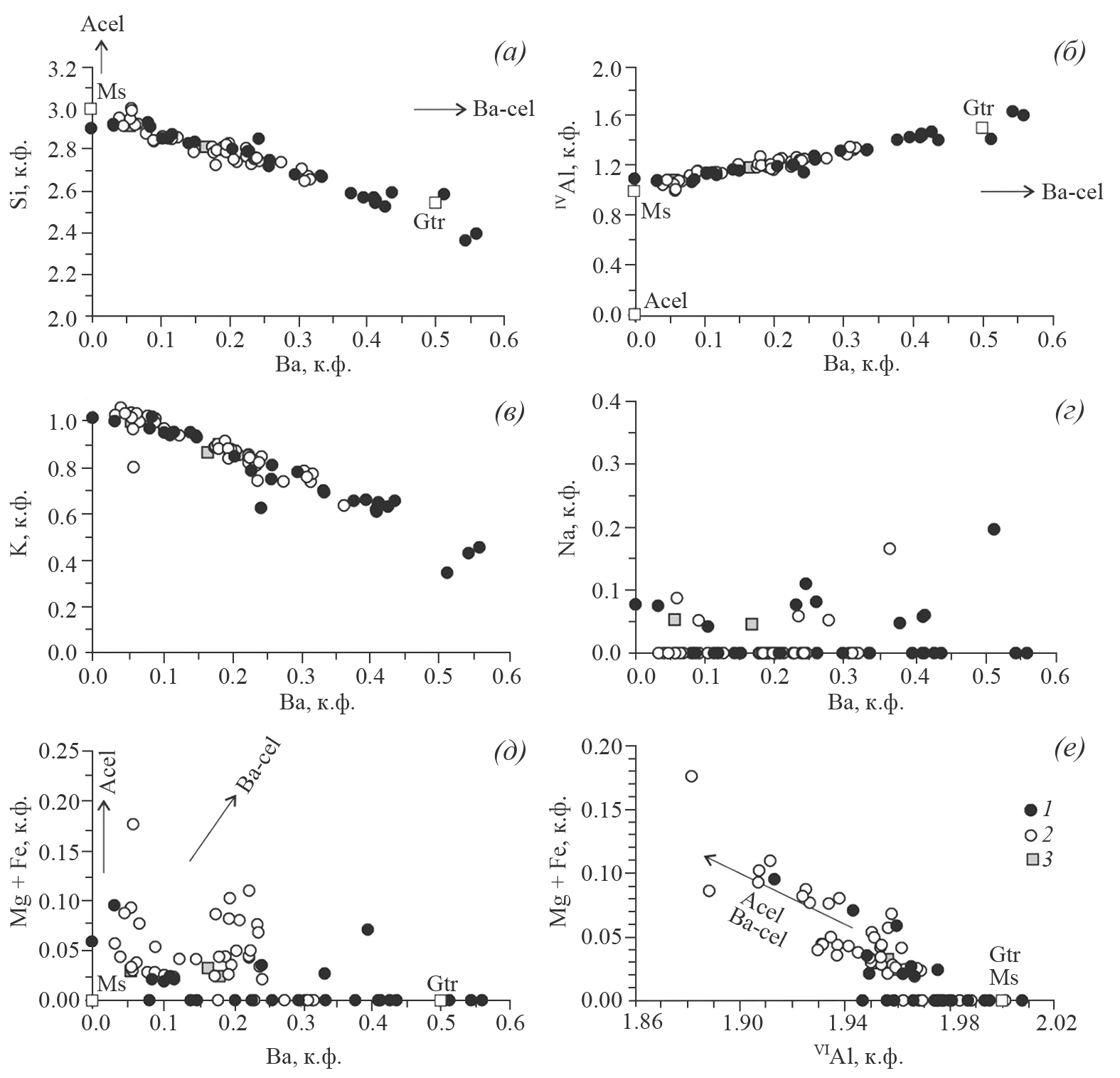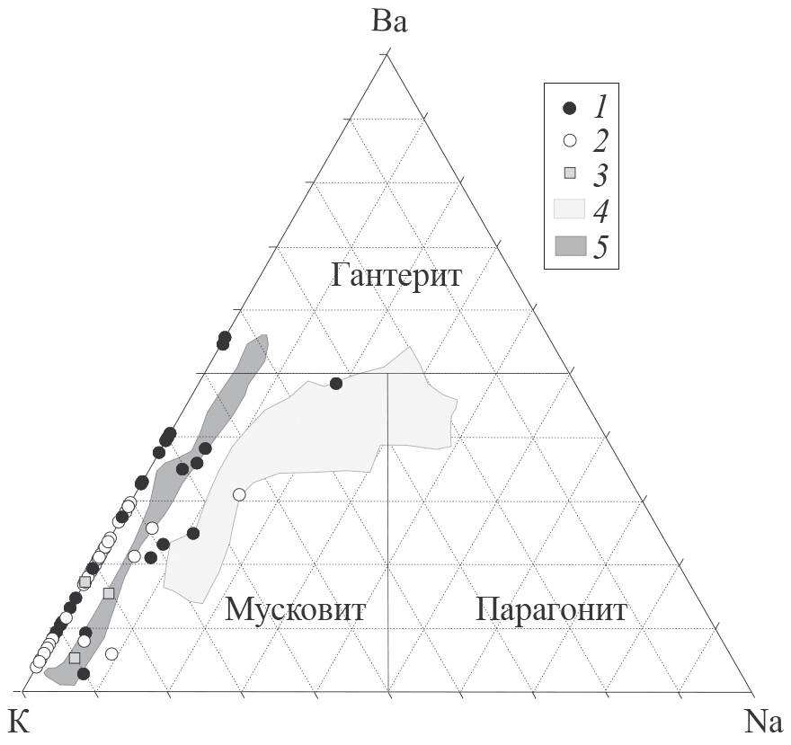 a, б — Ba-bearing muscovite from ijolites of the Sredneziminsky massif; в ‒ ganterite from the Berisal complex, Switzerland (Graeser et al., 2003).
