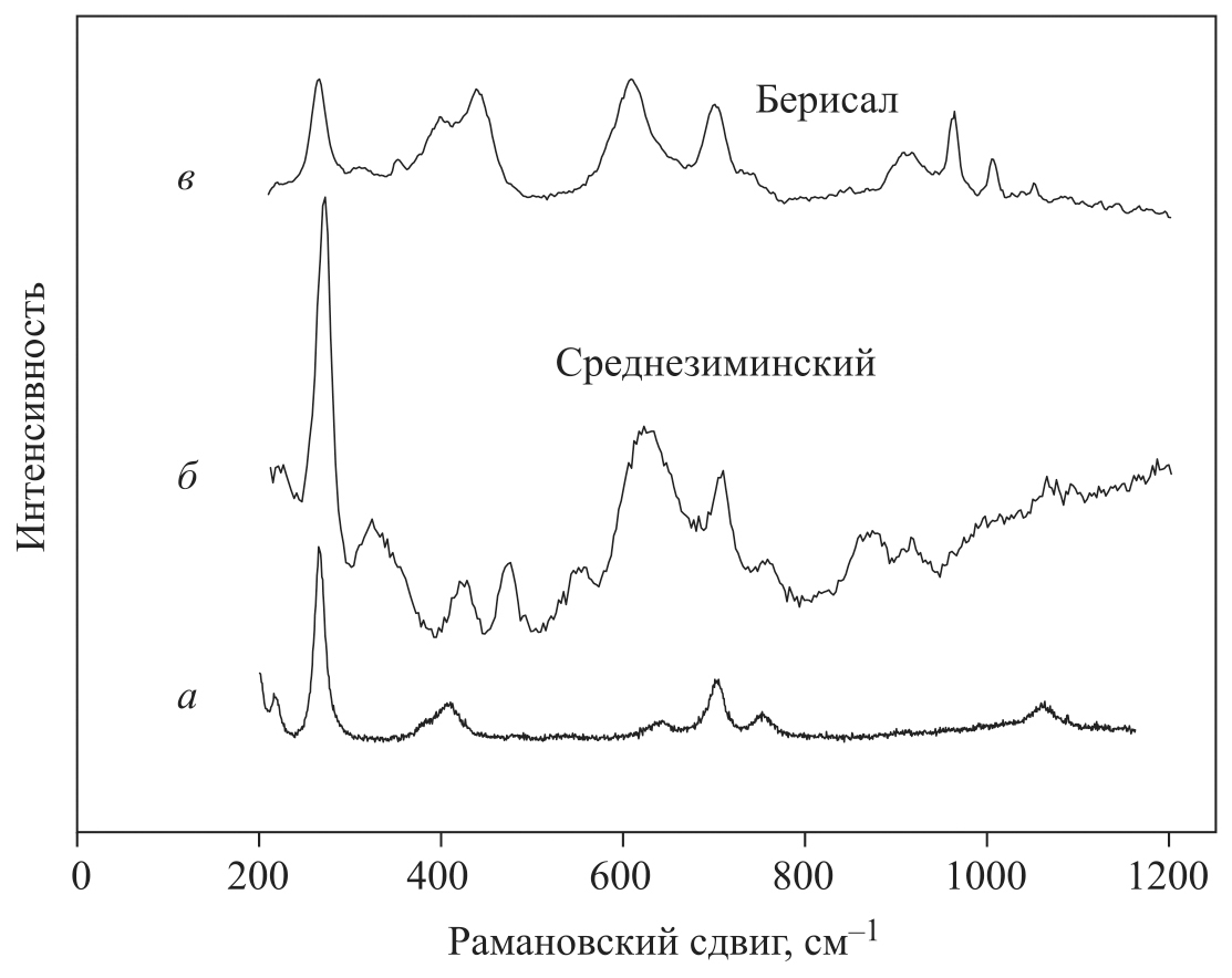 Спектры комбинационного рассеяния (КР) света получены на участках тонких срезов образцов ийолитов 33/21 и 161/21, где ранее методом энергодисперсионного микроанализа были выявлены скопления мелкочешуйчатого Ва-содержащего мусковита. Полученные КР-спектры слюды приведены на рис. 5. В подавляющем большинстве случаев богатая барием слюда имеет те же спектральные характеристики, что и мусковит, КР-спектры которого содержатся в базе данных RRUFF (Lafuente et al., 2015) (рис. 5, а). Это согласуется с результатами, полученными Ч. Ма и Дж.Р. Россманом (Ma, Rossman, 2006) при изучении барийсодержащего мусковита из месторождения Линкольн-Хилл. Однако небольшое количество полученных нами спектров существенно отличались от обычного мусковита (рис. 5, б) и напоминали спектры гантерита комплекса Берисал (рис. 5, в) (Graeser et al., 2003). Нами не проводились структурные исследования, поэтому причина различия в КР-спектрах остается неясной. При обсуждении причин различий КР-спектров гантерита из месторождения Линкольн-Хилл и комплекса Берисал Ч. Ма и Дж.Р. Россман предполагают, что гантерит комплекса Берисал с фенгитовым замещением и значительным парагонитовым компонентом имеет структуру, отличную от чистого мусковита (Ma, Rossman, 2006). Изучение структуры Ва-содержащего мусковита из комплекса Берисал (Armbruster et al., 2002) показало, что он имеет меньший объем элементарной ячейки, чем идеальный мусковит, из-за высокого содержания парагонитовой молекулы (концентрация Na 0.13–0.20 а.ф.). Установлено также (Brigatti et al., 1998), что замена VIAl на Mg, Fe и Ti в мусковите-2М1 приводит к увеличению толщины октаэдрического слоя, к меньшему отклонению тетраэдрического кольца от гексагональной симметрии и менее выраженному гофрированию базальных атомов О. Можно предположить, что отдельные зерна или участки зерен мусковита из ийолитов Среднезиминского массива, в которых проявлено значительное парагонитовое или фенгитовое замещение, также обнаруживают структурные изменения, которые выражаются в КР-спектрах.