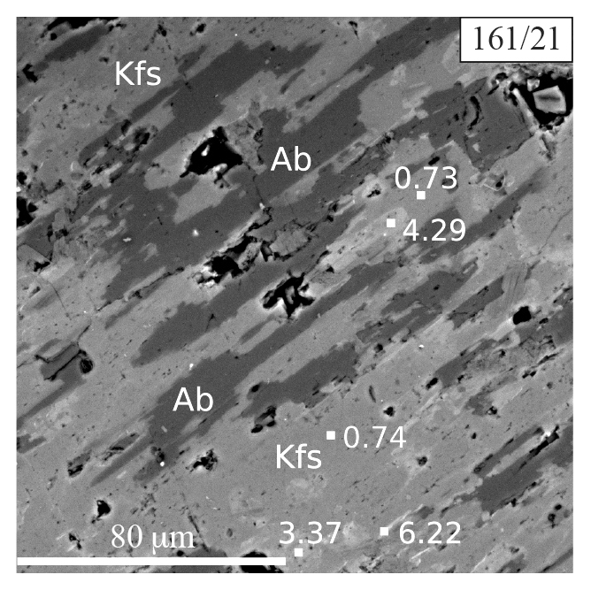 В образце сиенита 173/21 Ва-содержащий мусковит в ассоциации с анальцимом (табл. 1), кальцитом, цирконом, пирохлором находится в промежутках между зернами калиевого полевого шпата. Зональность в зернах слюды здесь не выражена. Цельзиан в этом образце не отмечен.
