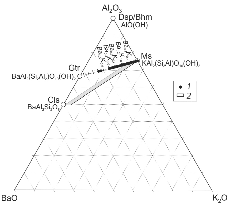 1 — точки состава Ва-содержащего мусковита из образцов ийолитов 33/21 и 161/21; 2 — состав цельзиана. Серая толстая линия соединяет состав цельзиана и точки состава ассоциирущего Ва-содержащего мусковита в обр. 161/21. Пунктирная линия соединяет конечные члены твердого раствора KAl2(Si3AlO10)(OH)2‒BaAl2(Si2Al2O10)(OH)2, подписи у поперечных линий показывают соотношение межслоевых катионов К+ и Ва2+ в формуле барийсодержащего мусковита.
