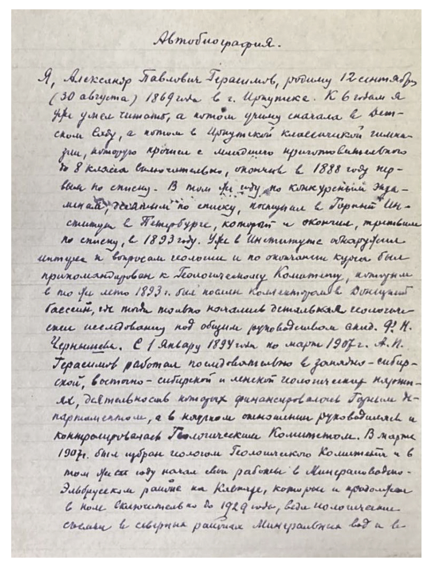 С 1 января 1894 г. по март 1907 г. А.П. Герасимов работал (начиная с этого места он пишет о себе в 3-м лице, почерк тот же. — Ю. В.) в Западно-Сибирской, Восточно-Сибирской и Ленской геологических партиях, деятельность которых финансировалась Горным департаментом, а в научном отношении руководилась и контролировалась Геологическим комитетом. В марте 1907 г. был избран геологом Геологического комитета и в том же году начал свои работы в Минераловодско-Эльбрусском районе на Кавказе, которые и продолжал в поле включительно до 1929 г., ведя геологические съемки в северных районах Минеральных Вод и в горных и высокогорных районах бассейна Средней и Верхней Малки, а также по северным склонам Эльбруса. В 1917 г. по выборам получил звание старшего геолога, которое сохраняет и до сих пор.