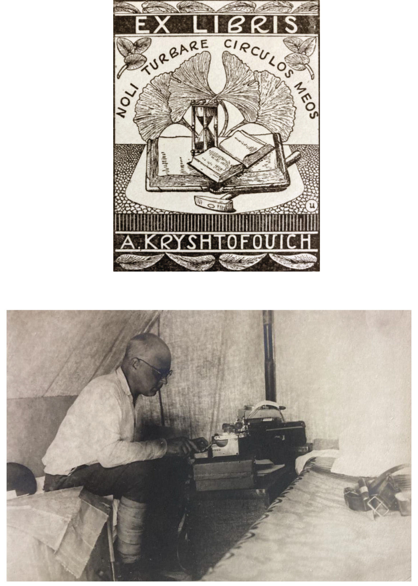 Fig. 4. А.N. Krishtofovich. On the back in the hand of D.P. Grigoriev: «received from V. M. Krishtofovich 15.IV.1964». On the ex-libris: «do not touch my circles» (Archimedes). Ginkgo leaves symbolise antiquity and rarity. There are several known fossils and only one modern species of this relict tree, growing in China and Japan.