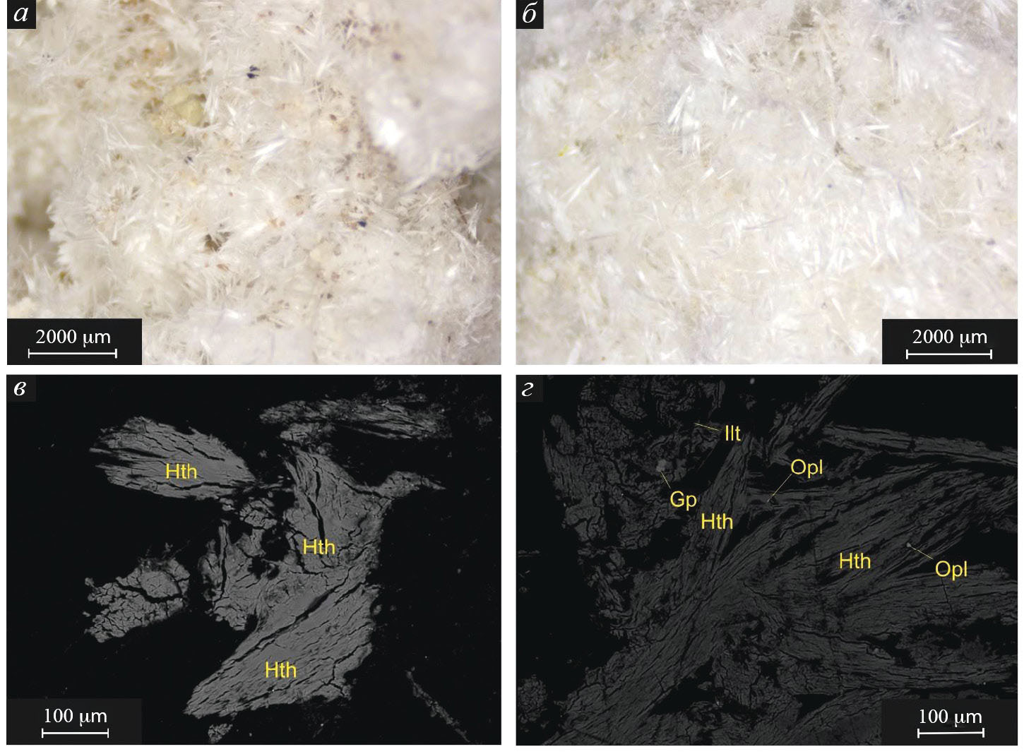 Рис. 1. Белые игольчатые кристаллы галотрихита с термального поля вулканического комплекса Большой Семячик (а, б) и изображения галотрихита в обратно-рассеянных электронах: (в) волокнистые агрегаты галотрихита (Hth), (г) галотрихит в ассоциации с опалом (Opl), гипсом (Gp) и иллитом (Ilt).