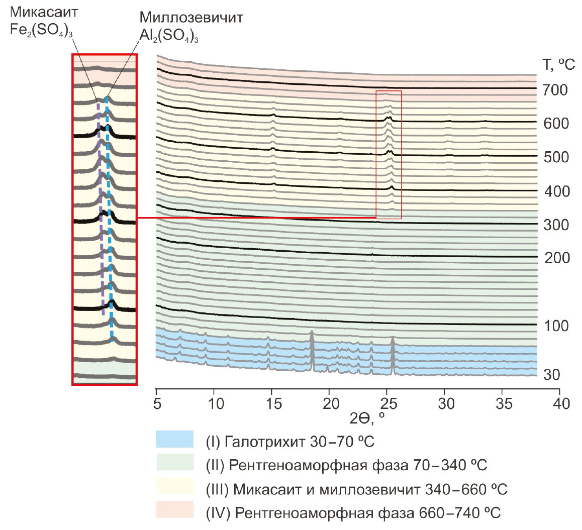 Устойчивость галотрихита и термическое преобразование. Галотрихит устойчив до температуры 70 °С, дальнейшее нагревание приводит к образованию рентгеноаморфной фазы (рис. 2). При температурах 340–360 °С появляются слабые рефлексы миллозевичита Al2(SO4)3, а при температурах 360–380 °С возникают рефлексы изоструктурного миллозевичиту микасаита Fe3+2(SO4)3 (табл. 1, рис. 2, 3). Несмотря на то, что микасаит и миллозевичит – изоструктурные минералы, они отличаются параметрами элементарной ячейки и, следовательно, положением рефлексов на рентгенограмме (рис. 3). Оба соединения оказались устойчивы до температуры 640 °С, однако в интервале 600–640 °С рефлексы микасаита становятся заметно менее интенсивными. В температурном интервале 660–740 °С вновь наблюдается рентгеноаморфная фаза.