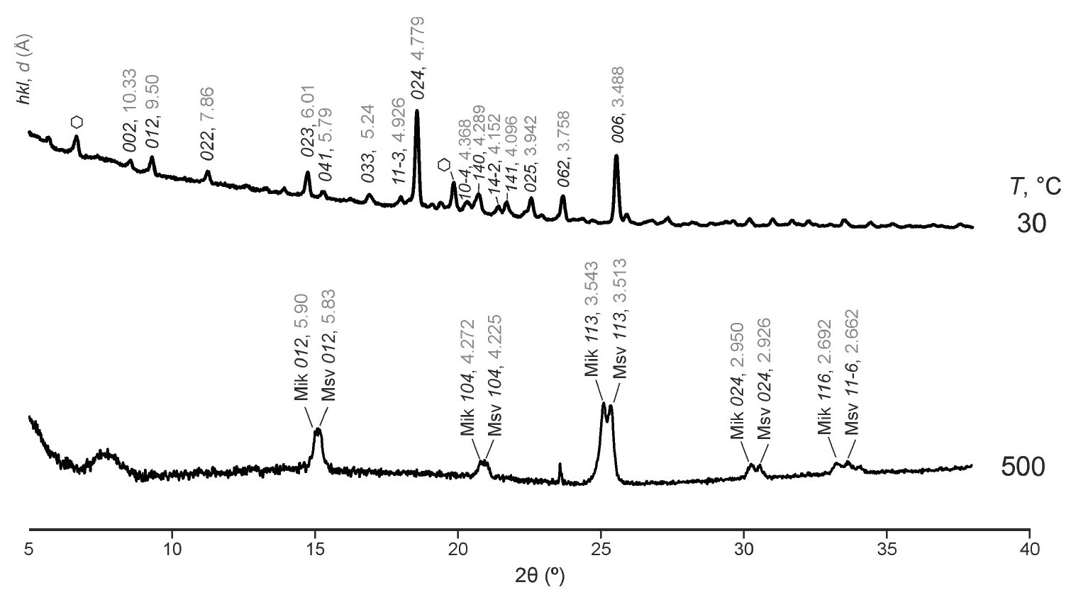 Рис. 3. Проиндицированные рентгенограммы галотрихита (с примесью алуногена, которая отмечена шестиугольником) при Т = 30 °С и смеси микасаита (Mik) с миллозевичитом (Msv) при Т = 500 °С.