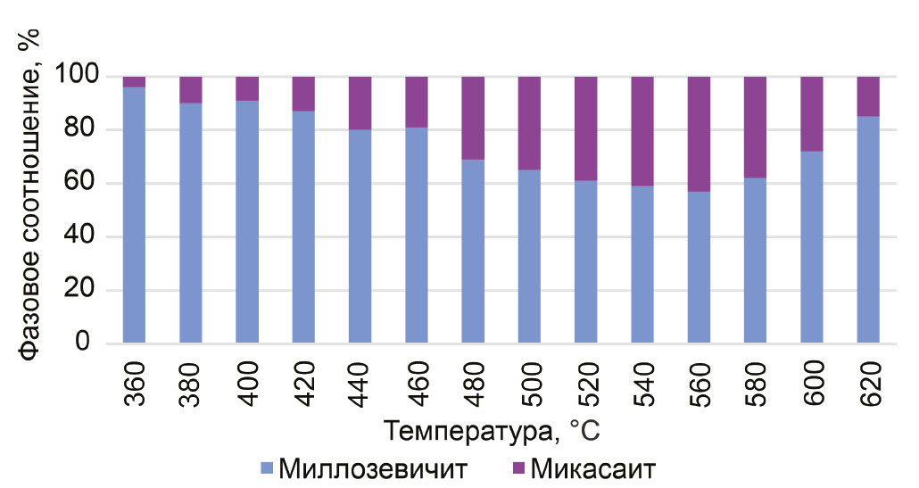 Определение количественного соотношения высокотемпературных фаз методом Ритвельда. По результатам фазового количественного анализа, миллозевичит превалирует в интервале температур 360–620 °С (рис. 4): его содержание варьировало от ~96 до ~57%, а количество микасаита не превышало 43%. Данные количественного фазового анализа по соотношению миллозевичита и микасаита представлены на рис. 4. В идеальной формуле галотрихита соотношение Al:Fe2+ = 2:1, а в экспериментально определенных формулах (Шевелева и др., 2023) в позиции Fe присутствует и Mg, соответственно, соотношение Al:Fe2+ выше, при этом в качестве небольшой примеси к галотрихиту может присутствовать водный сульфат Al – алуноген, что может еще более повышать превалирование Al над Fe. В области повышенных температур и сосуществования безводных сульфатов миллозевичит (сульфат алюминия) количественно существенно превалирует над микасаитом (сульфатом железа), однако их соотношение варьирует, что свидетельствует о присутствии рентгеноаморфной фазы переменного состава. Присутствие рентгеноаморфной фазы также связано с тем, что соотношение между катионами и сульфатом в продуктах разложения Al2(SO4)3 + Fe3+2(SO4)3 + ↑H2O не соответствует соотношению в исходной формуле Fe2+Al2(SO4)4·22H2O. Отдельно стоит отметить, что при нагревании происходит окисление железа, причем при температуре ниже 400 °С.