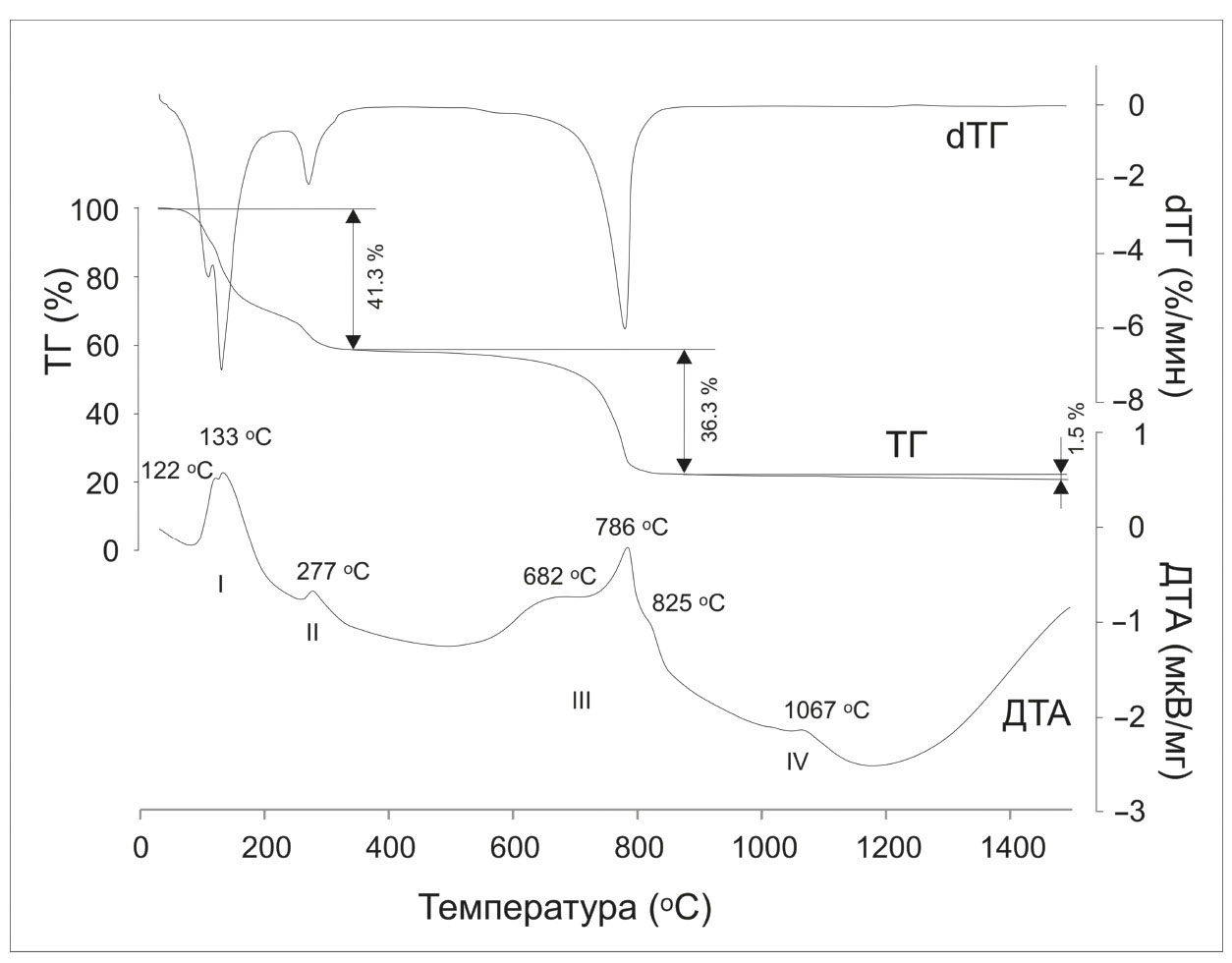 Рис. 5. Данные синхронного термического анализа галотрихита. Площадь пика кривой ДТА (в мкВс/мг): (I) 248.6; (II) 44.9; (III) 1342; (IV) 46.8.