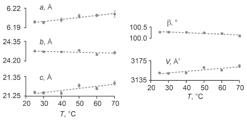 Рис. 6. Графики зависимостей параметров элементарной ячейки (пэя) от температуры. Уравнения аппроксимации: a = 6.1899(18) + 0.320(40)*T*10-3 (R2 = 0.93); b = 24.287(14) – 0.43(31) *T*10-3; c = 21.239(14)+ + 1.01(32)*T*10-3 (R2 = 0.74); β = 100.346(3) – 2.2(6)*T*10-3 (R2 = 0.68); V = 3140.6(4.7) + 289(104)*T*10-3 (R2 = 0.73), где R2 – коэффициент детерминации, Т – температура.