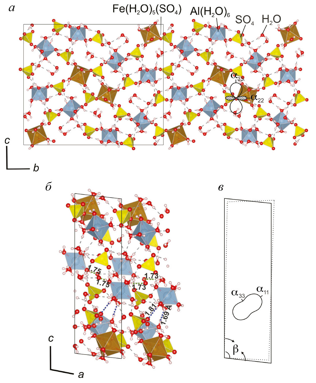 Fig. 7. Correlation of the crystal structure of halotrichite and the TEC figure in the cb plane (a), crystal structure and hydrogen bonds in the ac plane (б), decrease (compression) of the β angle upon heating, and the TEС figure in the ac plane (в).