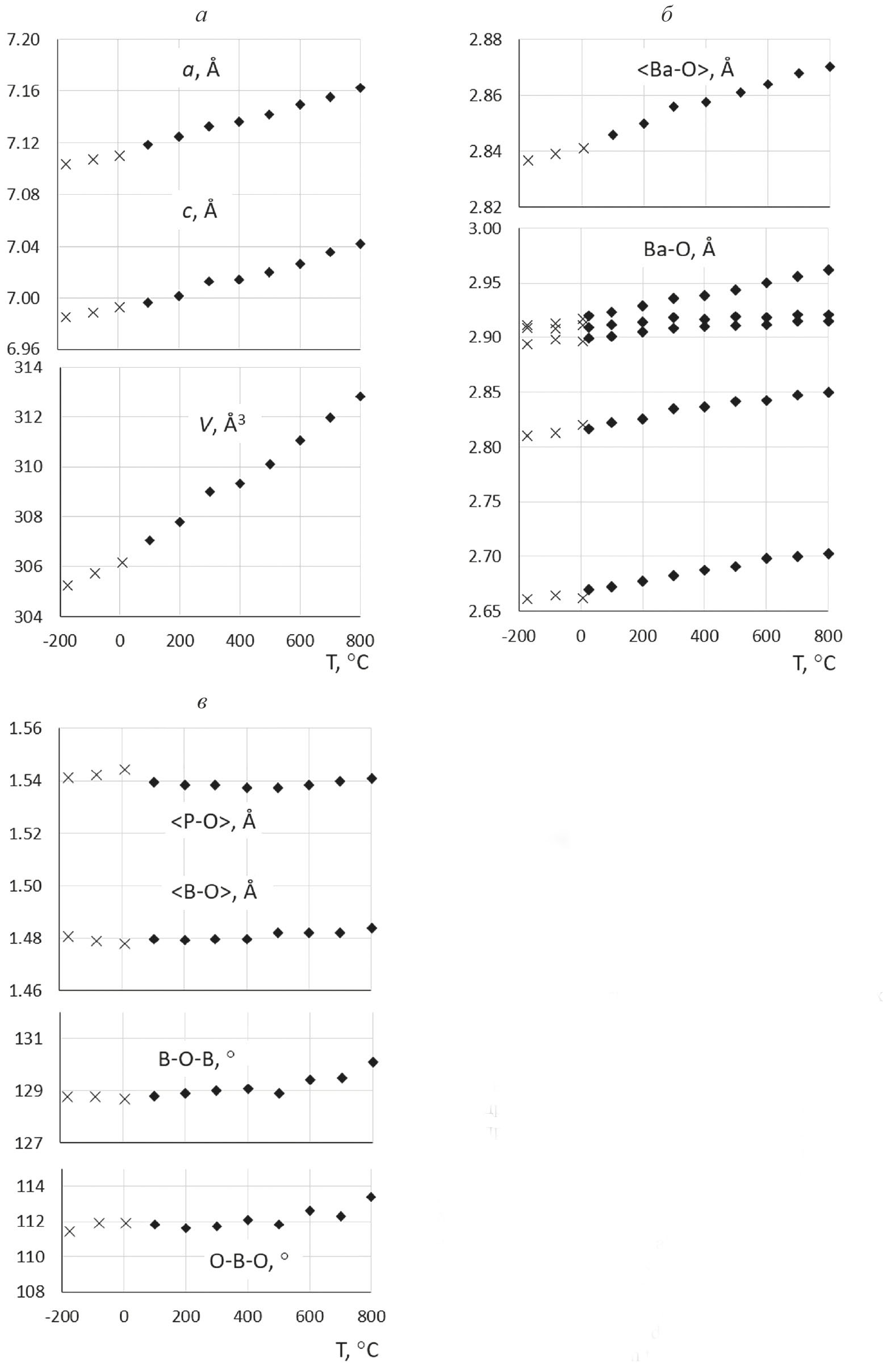 Fig. 3. The evolution of the geometrical characteristics of BaBPO5 from single crystal LT and HT SCXRD data: (a) the unit-cell parameters vs T, (б) Ba–O bond lengths vs T, (в) average bond lengths in PO4 and BO4 tetrahedra, B–O–B and O–B–O angles in the BO4 chain. LT data are shown by crosses, HT data – by rhombs. Standard deviations are smaller than the symbols’ size.