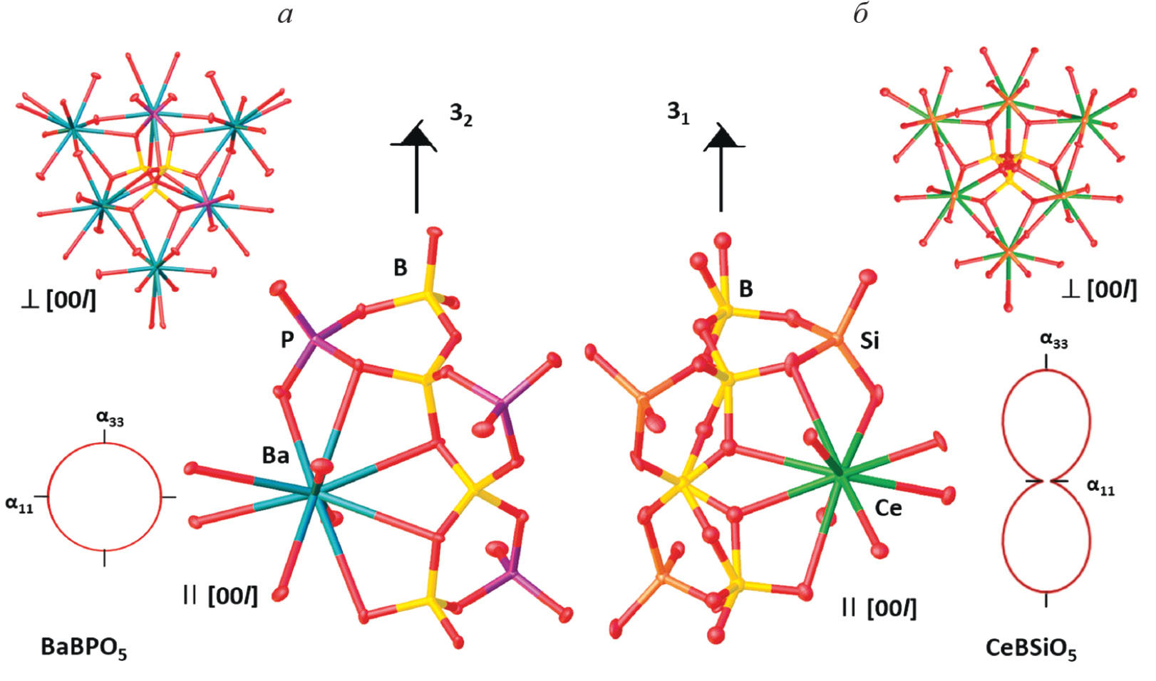 Проекции кристаллических структур BaBPO5 и CeBSiO5 в сравнении представлены на рис. 4. Обе структуры образованы цепочками, состоящими из тетраэдров BO4 и PO4 или BO4 и SiO4 для BaBPO5 и CeBSiO5 соответственно. Исследованная в данной работе кристаллическая структура BaBPO5 полностью упорядочена (рис. 4, a) и имеет неполярную пространственную группу P3221 (Shi et al., 1998; Pushcharovskii et al., 2002; Pan et al., 2003). Цепочки в структуре стиллуэллита-(Се) частично разупорядочены в связи с расщеплением позиции кислорода в полиэдре BO4, что приводит к понижению симметрии CeBSiO5 и его кристаллизации в сегнетоэлектрической пр. гр. P31. Как показали исследования in situ, BaBPO5 не претерпевает превращений при нагревании и расширяется практически изотропно. Данные результаты хорошо согласуются с данными о термической стабильности BaBPO5, полученными ранее по результатам спектроскопии при нагревании (Lei et al., 2014; Zhang et al., 2017). Исследование кристаллической структуры CeBSiO5 при нагревании показало, что процесс порядок – беспорядок является одной из движущих сил, влияющих на обратимый фазовый переход, типичный для стиллуэллитоподобных структур. В случае с BaBPO5 мы наблюдаем отсутствие как разупорядочения в кристаллической структуре, так и термических фазовых переходов. Более того, сильная анизотропия термического расширения стиллуэллита-(Се) (рис. 4, б) связана с процессами упорядочения. Полностью упорядоченная структура BaBPO5 практически не имеет анизотропии теплового расширения, хотя известно, что, например, для силикатов или боратов цепочечные структуры обычно проявляют резкую анизотропию физических свойств (Bubnova, Filatov 2013; Hazen, Downs, 2000). Тетраэдры в обеих структурах термически жесткие; индивидуальные расстояния в них при нагревании не изменяются, однако разупорядочение борокислородной цепи в природной модификации CeBSiO5 определяет анизотропию ее термического расширения. Природа крупного катиона играет большую роль в характере термического поведения. Так, в сравнении с неполярной высокотемпературной формой LaBSiO5 (αV = 16) или CeBSiO5 (αV = 19) объемное расширение BaBPO5 (αV = 25 ⋅ 10-6 °C-1) увеличивается при замене более мелкого трехвалентного катиона ([X]Rion = 1.27 (La), 1.25 Å (Ce)) на двухвалентный барий ([X]Rion = 1.53 Å; Shannon, 1976), при этом общий, практически изотропный характер расширения остается неизменным.