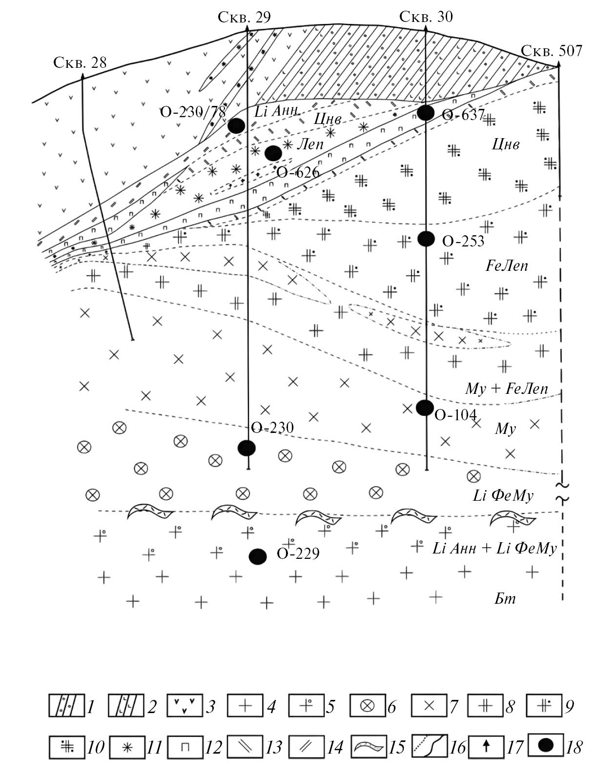 1 — терригенно-осадочные породы, 2 — прослои трахириодацитов, 3 — дайка лампрофиров догранитного возраста, 4—11 — граниты: 4 — порфировидные биотитовые, 5 — двуслюдяные, 6 — порфиробластовые микроклин-альбитовые с гороховидным кварцем, 7 — микроклин-альбитовые с зеленым мусковитом, 8 — амазонит-альбитовые с железистым лепидолитом и зеленым мусковитом, 9 — амазонит-альбитовые с железистым лепидолитом, 10 — амазонит-альбитовые с циннвальдитом, 11 — альбит-амазонитовые с лепидолитом; 12 — кварц-амазонит-альбитовые пегматоидные тела, 13 — циннвальдит-топазовый грейзен эндоконтакта, 14 — топаз-Li-содержащий глиноземистый аннитовый грейзен с бериллом экзоконтакта, 15 — маломощные пегматоидные кварц-полевошпатовые тела на границе двуслюдяных и порфиробластовых гранитов, 16 — границы постепенные (а) и резкие (б), 17 — разведочные скважины, 18 — места отбора проб.