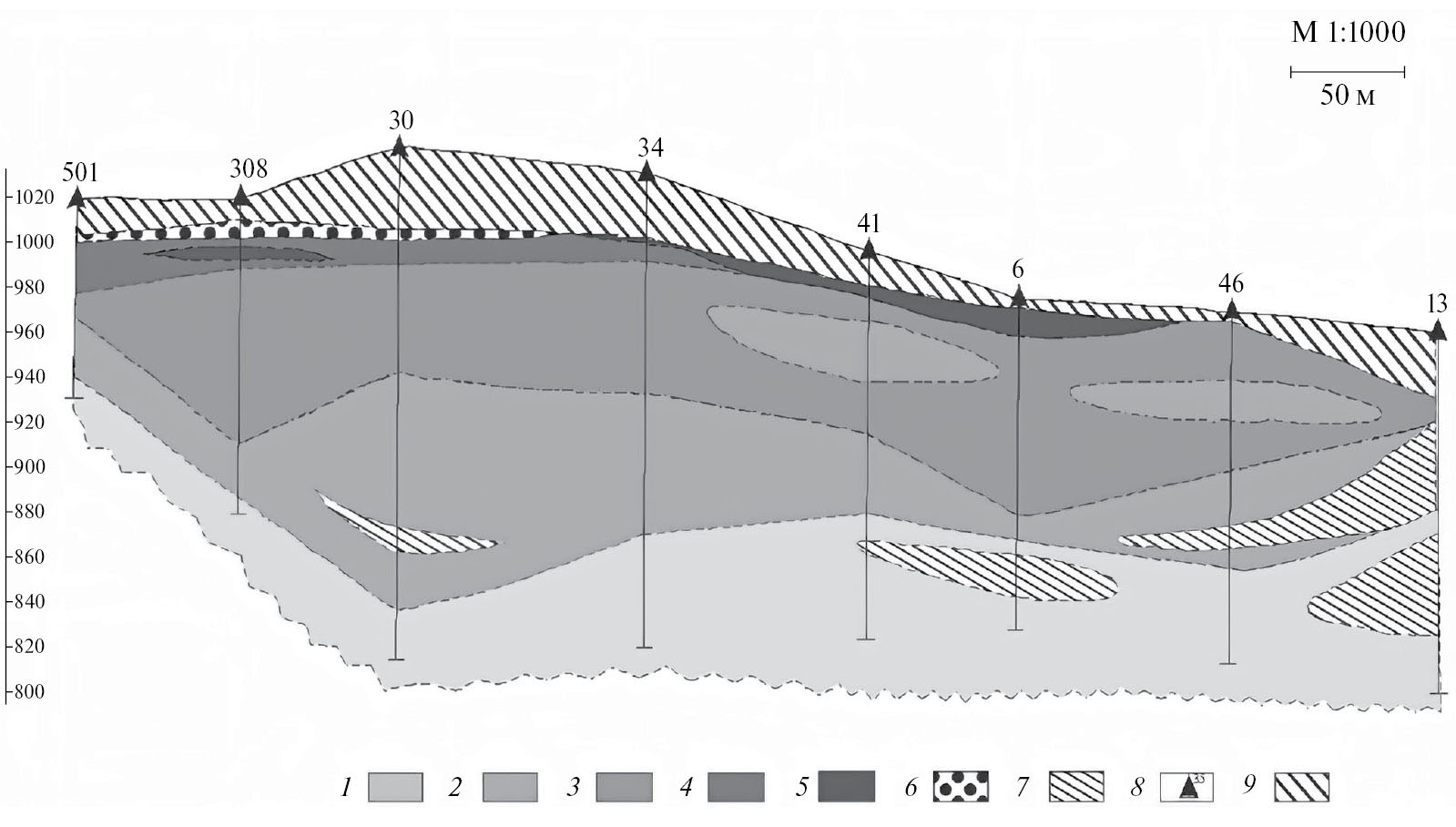 1 — зеленый мусковит, 2 — зеленый мусковит и железистый лепидолит, 3 — железистый лепидолит, 4 — циннвальдит, 5 — лепидолит, 6 — Li-содержащий аннит, 7 — линзы бесслюдяных альбититов, 8 — буровые скважины и их номера, 9 — вмещающие породы.