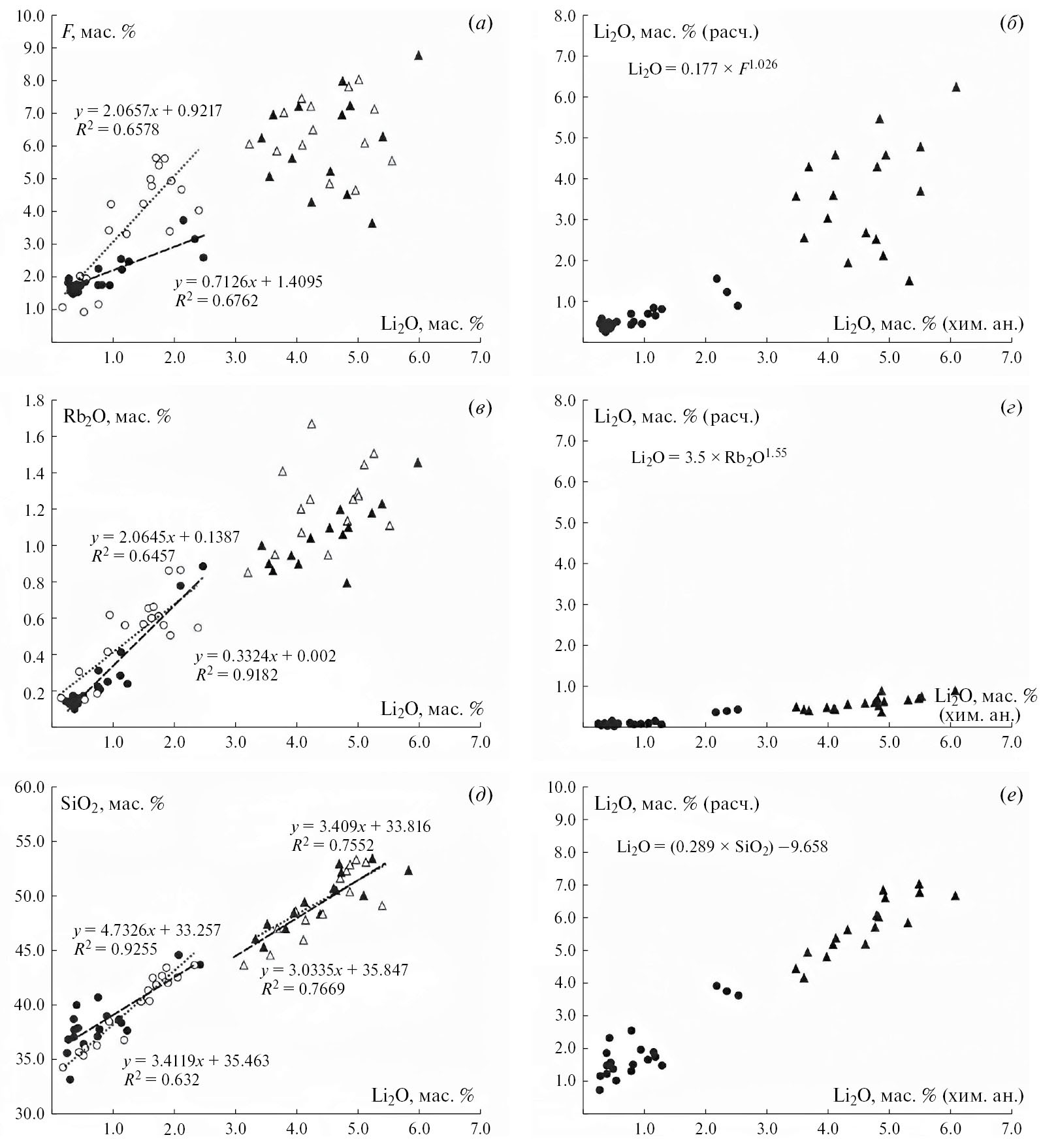 Рис. 3. Оценка концентрации лития в слюдах на основе расчета по эмпирическим формулам Г. Тишендорфа (Tischendorf, 1997) и ее корреляция с данными химического анализа (фотометрия пламени): по содержанию фтора (а, б), рубидия (в, г) и кремния (д, е).