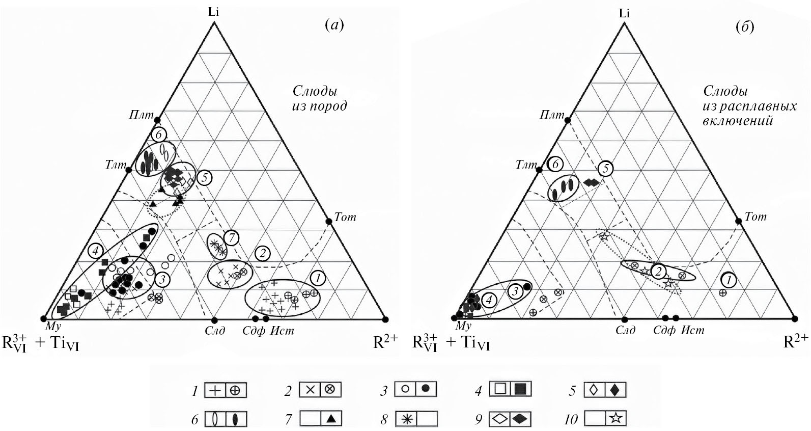 Рис. 4. Составы слюд из пород (а) и расплавных включений в кварце (б) Хангилайского и Орловского массивов (первый символ — по данным «мокрой химии», второй символ — по данным микрозондового анализа). Штриховые линии — границы областей составов ди- и триоктаэдрических слюд. Точечные линии — границы полей разновидностей. Разновидности пород: Хангилайский массив: 1 — биотитовые граниты, Орловский массив: 2 — двуслюдяные граниты, 3 — порфиробластовые микроклин-альбитовые граниты, 4 — альбититы с зеленым мусковитом, 5 — амазонит-альбитовые граниты с железистым лепидолитом, 6 — амазонитовые граниты с лепидолитом, 7 — пегматоиды, 8 — циннвальдит-альбит-топазовые грейзены эндо-экзоконтакта, ЮЗ участок: 9 — амазонитовые граниты с железистым лепидолитом,10 — пегматоиды. Цифры в кружках: 1 — биотит, 2 — Li-содержащий глиноземистый аннит, 3 — Li-содержащий фенгит-мусковит, 4 — мусковит, 5 — Fe лепидолит, 6 — лепидолит, 7 — циннвальдит. Му — мусковит, Тлт — трилитионит, Плт — полилитионит, Тот — тайниолит, Фл — флогопит, Ан — аннит, Ист — истонит, Сдф — сидерофиллит, Слд — селадонит. Классификация и номенклатура слюд по (Лапидес и др., 1977).