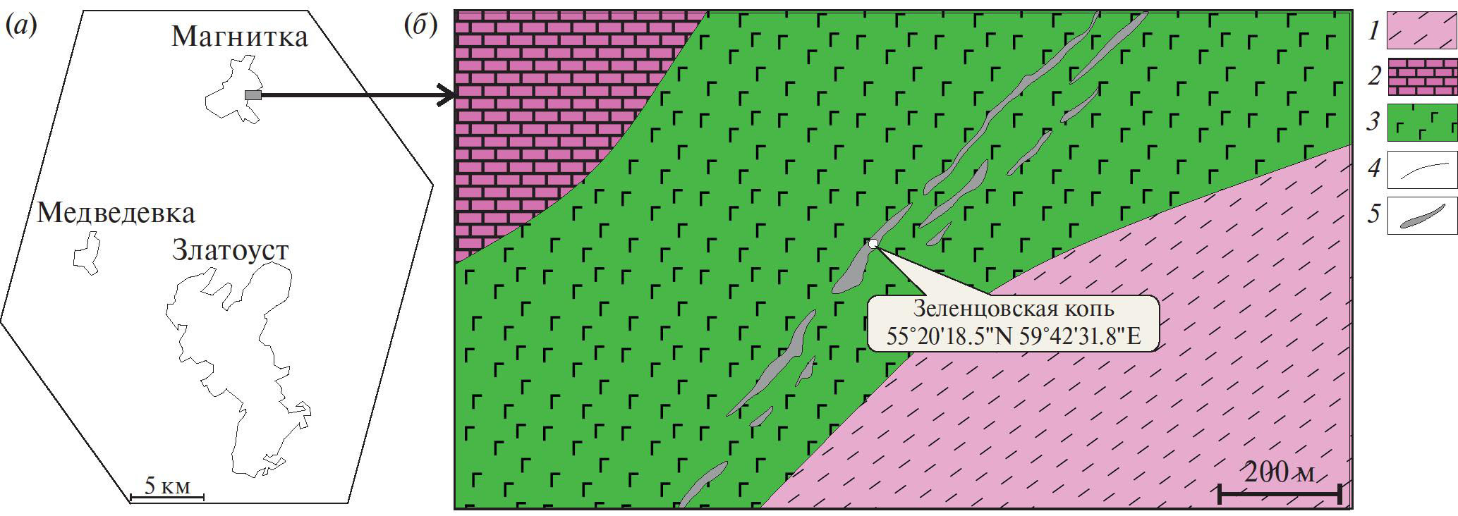 Зеленцовская копь заложена на западном склоне Южного Урала (Чернореченский хребет) в пределах массива габброидов кусинско-копанского клинопироксенит-габбро-гранитного интрузивного комплекса (рис. 1б). Последний расположен в зоне субмеридионального Зюраткульского глубинного разлома, который разделяет Тараташский антиклинорий и Кувашско-Машакскую структуру (Алексеев и др., 2000). Массив габброидов образован двумя фазами внедрения среднерифейского возраста. Первая фаза представлена дифференцированными породами основного состава — габбро, габброноритами, горнблендитами и клинопироксенитами с вкрапленностью рудных минералов. Вторая фаза сложена гранитоидами. В связи с формированием последних, отдельные участки пород первой фазы подверглись эпидотизации, амфиболитизации и фельдшпатизации (Алексеев и др., 2000; Аулов и др. 2015). Массив сформировался в интервале 1390—1350 млн лет (Краснобаев и др., 2006; Холоднов и др., 2006, 2010).