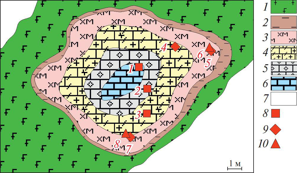 1 — амфиболизированное и эпидотизированное габбро, 2 — роговик, 3 — гранат-везувиан-оливиновый скарн (магнезиальный скарн), 4 — гранат-клиногумит-везувиановый мрамор, 5 — бруситовый мрамор, 6 — мрамор, 7 — задерновано, 8—10 — точки отбора образцов (8 — равномернозернистых пород, 9 — неравномернозернистых пород, 10 — жил и прожилков).