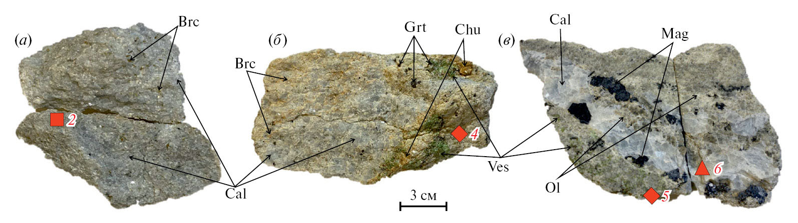 а — равномернозернистый бруситовый мрамор, б — переход равномернозернистого брусит-хлорит-клиногумитового мрамора в пятнистый неравномернозернистый гранат-клиногумит-везувиановый мрамор, в — гранат-везувиан-оливиновый скарн с кальцитовым прожилком и магнетитом на зальбандах. Цифрами отмечены точки отбора проб (нумерация соответствует табл. 1).