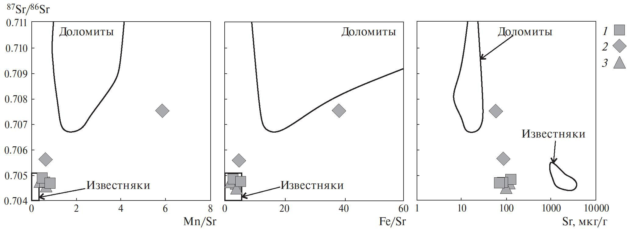 Рис. 4. Бинарные диаграммы зависимости отношения 87Sr/86Sr от отношений Mn/Sr и Fe/Sr и содержания Sr для кальцита из равномернозернистых пород (1), неравномернозернистых пород (2), жил и прожилков (3). На диаграммы вынесены поля с аналогичными данными для известняков казымовской и доломитов карагайской пачек саткинской свиты (Кузнецов и др., 2008).