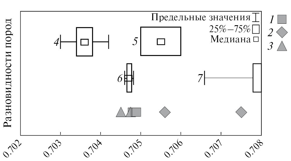 Рис. 5. Измеренное отношение 87Sr/86Sr в породах и минералах.