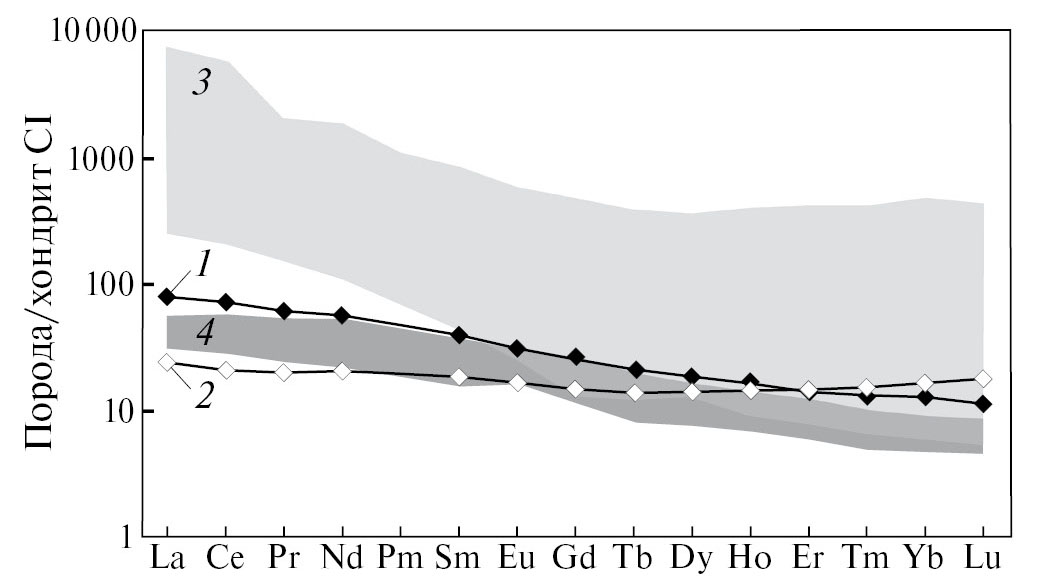 В двух валовых пробах с преобладанием силикатной компоненты (более 95 %) анализировались содержания РЗЭ методом масс-спектрометрии с индуктивно-связанной плазмой (ICP-MS) на квадрупольном масс-спектрометре ELAN-DRC-6100 по стандартной методике с использованием кислотного разложения в смеси кислот HF + HNO3 (ВСЕГЕИ). Относительная погрешность определения для РЗЭ менее 5 %, нижние пределы обнаружения — 0.005—0.010 мкг/г (табл. 3).