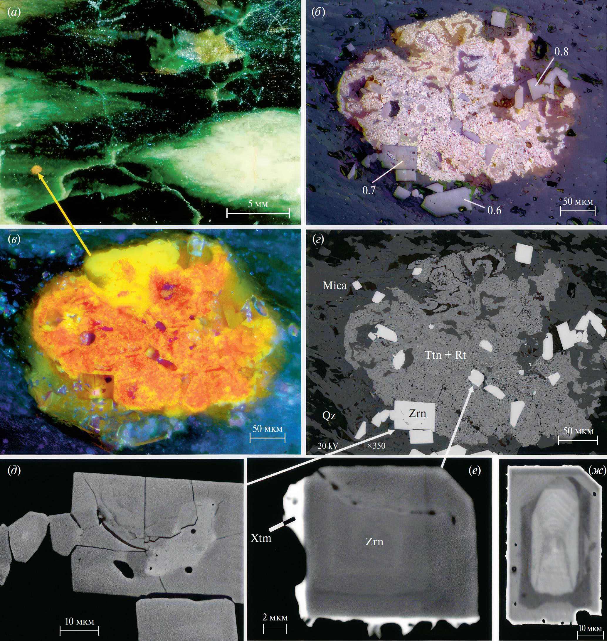 Fig. 4. Association of zircon crystals with titanium-bearing and rare earth minerals: a — isometric accumulation of titanium-bearing minerals and zircon in a fuchsite aggregate; б — the same in reflected light without an analyzer with marks of zircon crystals used for geochronological data, the results are shown on figure 15; в — the same with an analyzer; г — the same, BSE image, д — rounded mineral inclusions in the zonal structure of zircon (BSE image), е — xenotim growth on zircon (BSE image), ж — rounded mineral inclusions in the outer zone of zircon (BSE image). Ttn — titanite, Rt — rutile, Qz — quartz, Xtm — xenotime, Zrn — zircon.