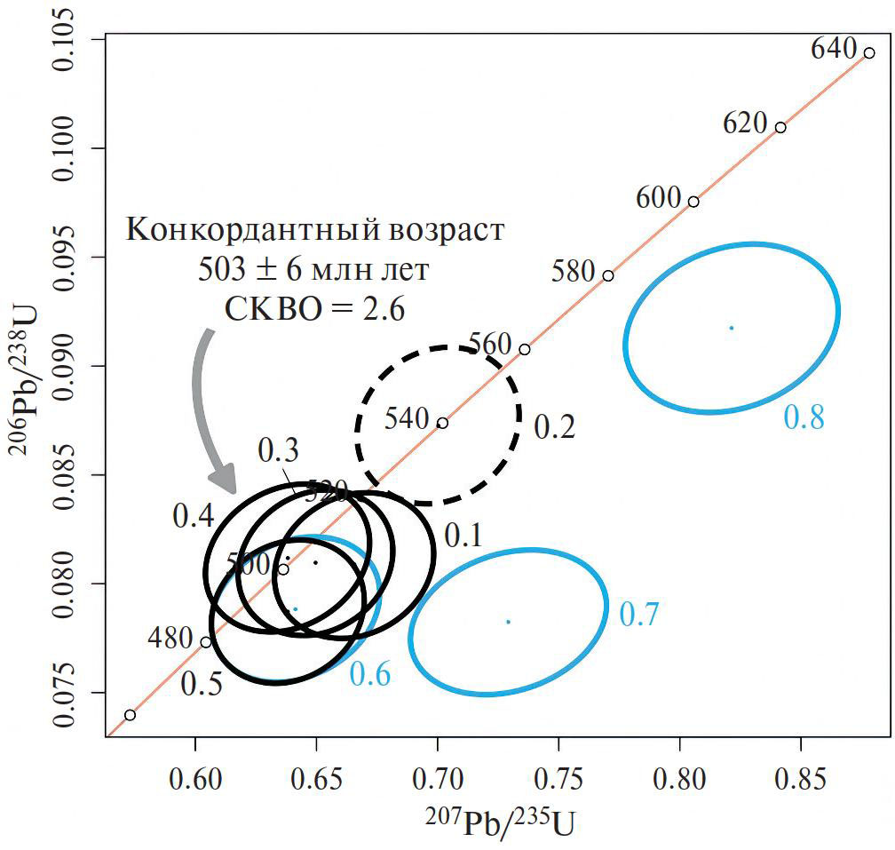 Результаты, полученные по трем кристаллам циркона и внешней части зонального кристалла из первого образца (рис. 5, анализы 0.1, 0.3, 0.4, 0.5 в табл. 1), дают конкордантный возраст 503 ± 6 млн лет, СКВО 2.6; возраст, полученный по ядру зонального кристалла циркона (анализ 0.2), составляет 539 млн лет (рис. 6).