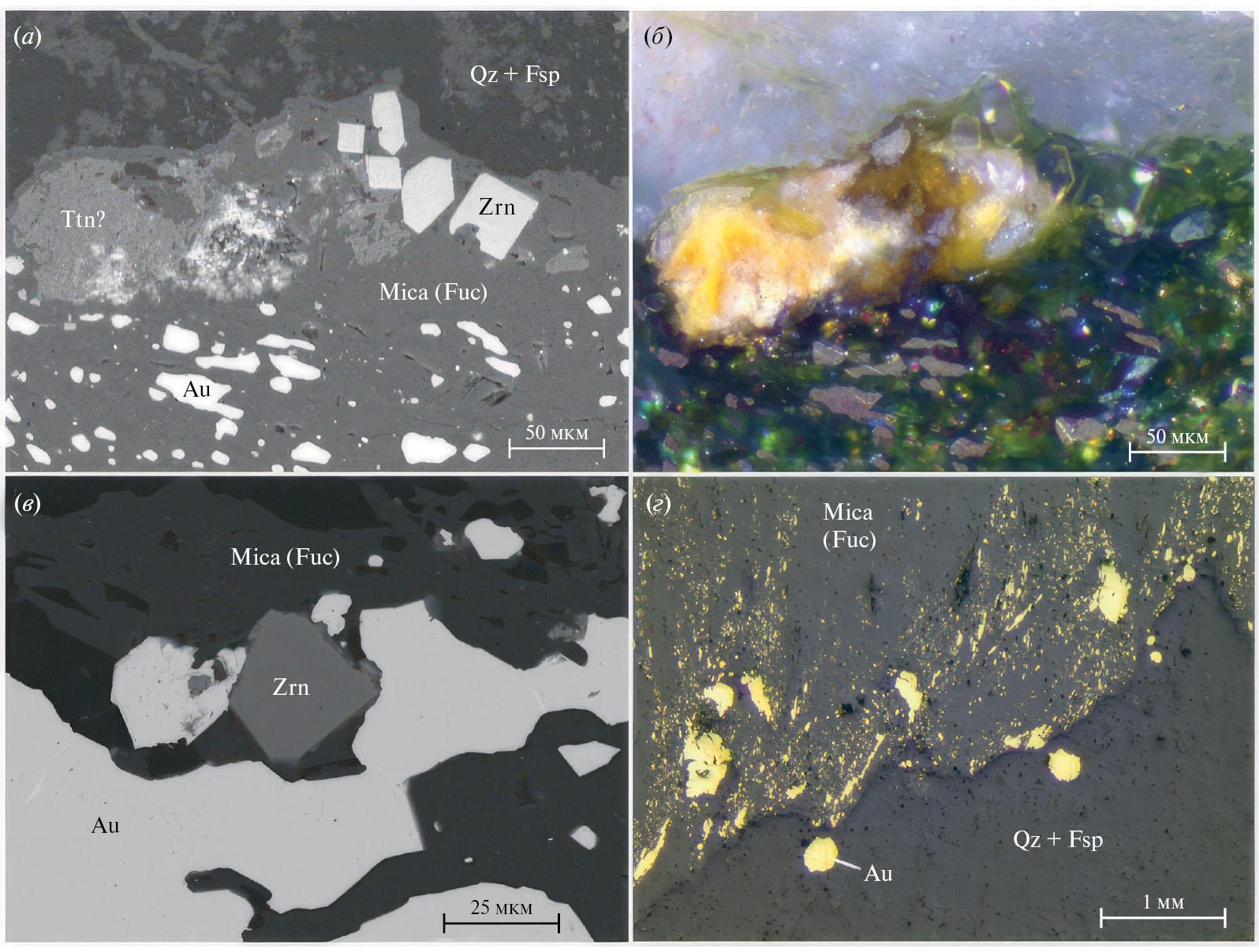 Рис. 9. Пространственные взаимоотношения циркона и золота с другими минералами: а — приуроченность кристаллов циркона к контакту золотоносного фукситового прожилка с метариолитами (изображение в обратно-отраженных электронах), б — то же в отраженном свете с анализатором, в — контакт идиоморфного кристалла циркона с золотом в фукситовом агрегате (изображение в обратно-отраженных электронах); г — изометричные золотины в метариолите у контакта с фукситовым агрегатом, в котором преобладают тонкие пластинчатые выделения золота (отраженный свет без анализатора). Au — золото, Mica (Fuc) — слюда (фуксит), Ttn? — титанит(?), Qz — кварц, Fsp — полевой шпат, Zrn — циркон.