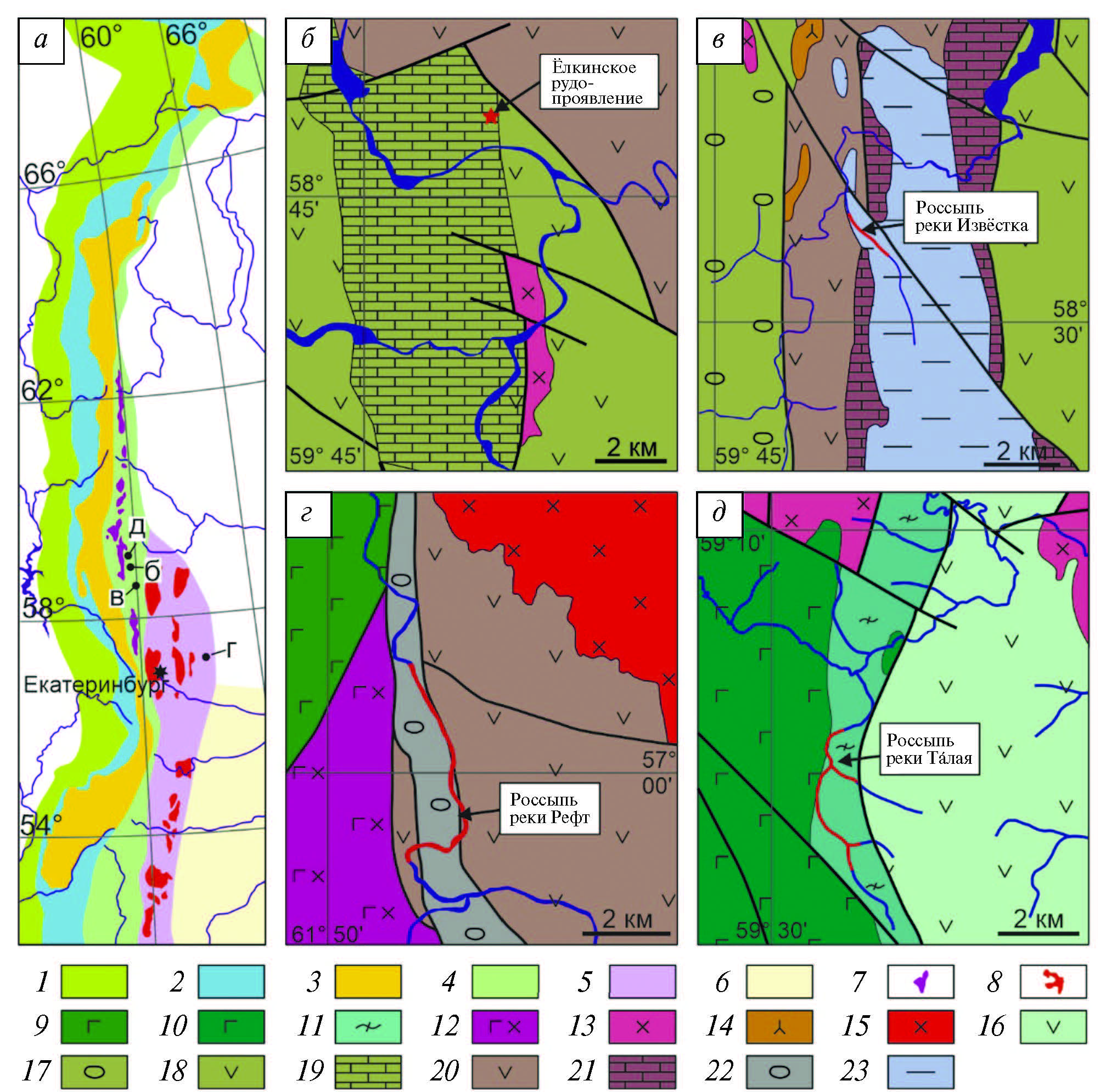 а — tectonic zones of the Urals according to (Puchkov, 2010), б–д — geological structure of the study areas. 1 — Preuralian foredeep, 2 — West Uralian zone, 3 — Central Uralian zone, 4 — Tagilo-Magnitogorskian zone, 5 — East Uralian zone, 6 — Transuralian zone, 7 — Platinum-bearing Belt massifs, 8 — Main Granitic Axis massifs, 9 — Vendian gabbro of dunite-harzburgite-gabbro formation, 10 — Ordovician gabbro of dunite-clinopyroxenite-gabbro formation, 11 — Ordovician amphibolized dolerites and gabbro, 12 — Silurian gabbrodiorites, 13 — Silurian diorites and granodiorites, 14 — Silurian-Devonian syenites, 15 — Devonian diorites and granites, 16 — Ordovician mafic volcanic and sedimentary rocks, 17 — Silurian terrigenous rocks, 18 — Silurian mafic volcanic rocks, 19 — Silurian limestones, 20 — Devonian mafic volcanic and sedimentary rocks, 21 — Devonian limestones, 22 — Carboniferous terrigenous rocks, 23 — Jurassic clays.