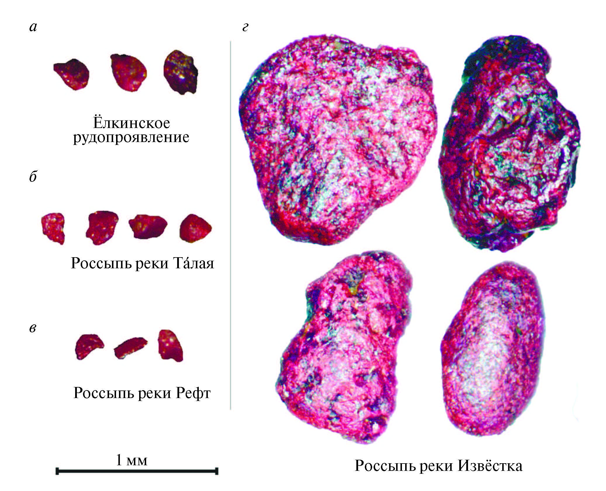 Fig. 3. Photographs of cinnabar grains from various deposits: а — eluvium and diluvium of Yolkinskoe mercury occurrence, б –Talaya River alluvium, в — Reft River alluvium, г — Izvyostka River alluvium.