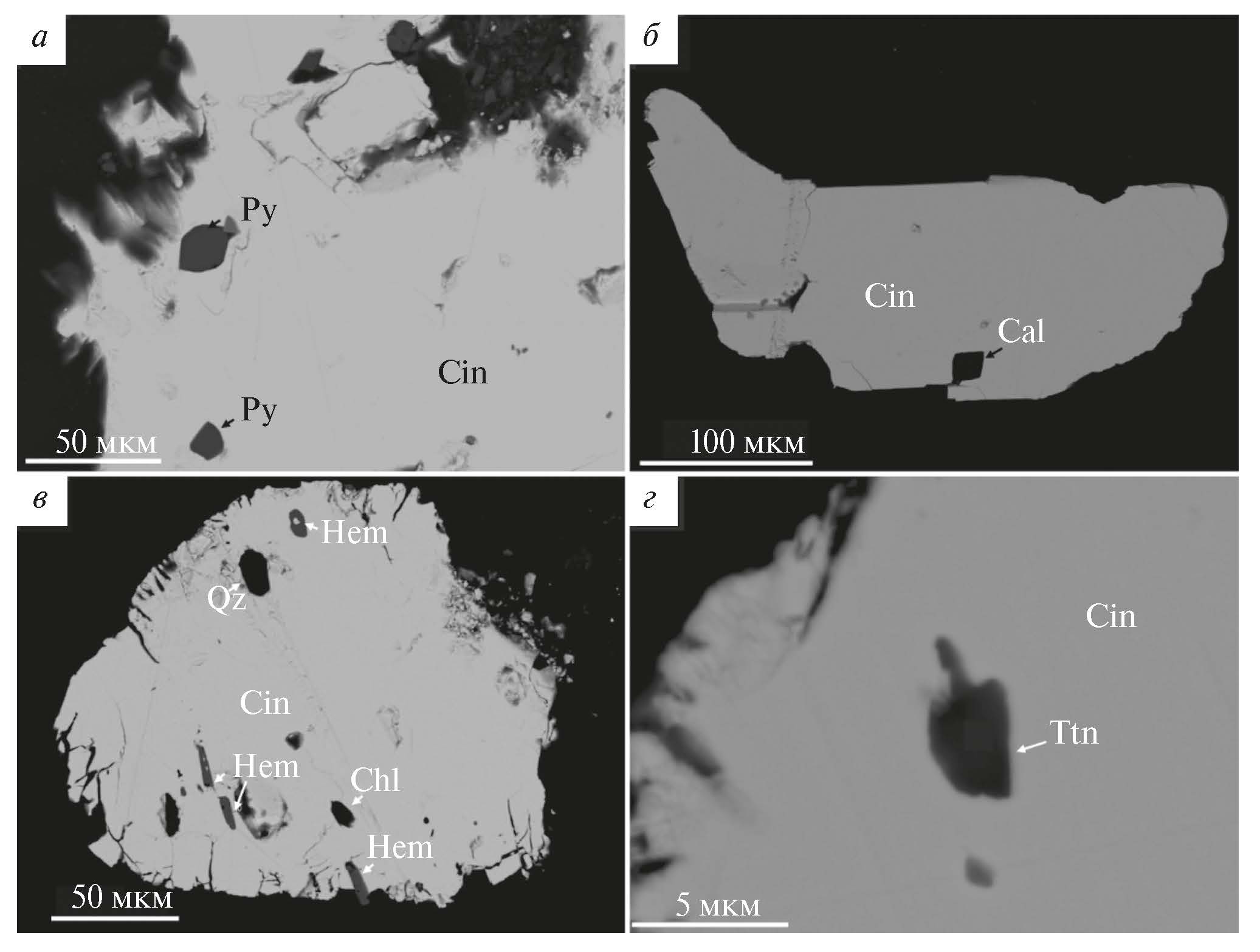 Рис. 4. Включения минералов в киновари. а, б — делювиальные отложения Ёлкинского рудопроявление, в — россыпь реки Рефт, г — россыпь реки Та`лая. Qz — кварц, Cal — кальцит, Ttn — титанит, Cin — киноварь, Py — пирит, Hem — гематит.