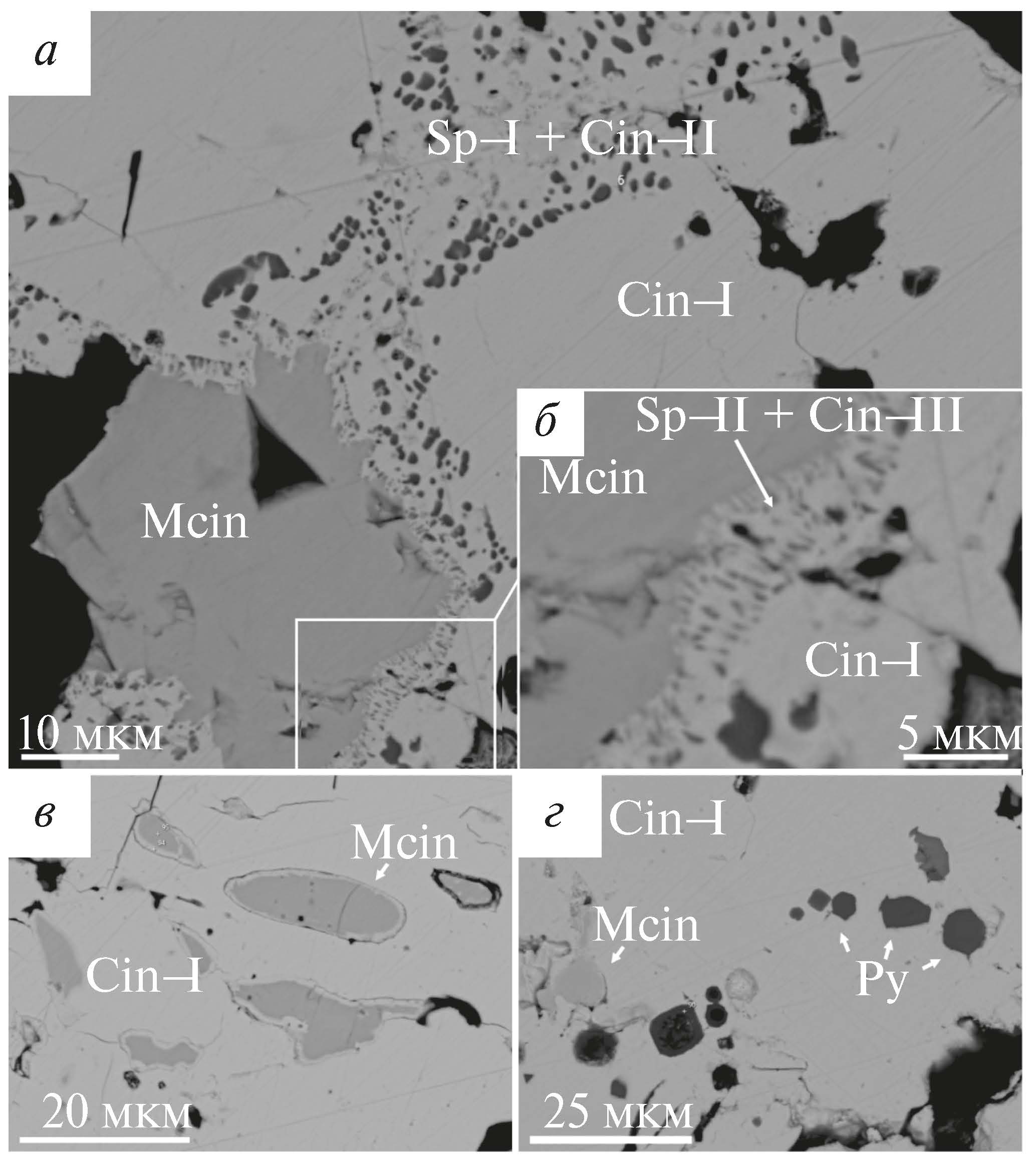 Fig. 5. Mineral inclusions in cinnabar from Izvyostka River placer. Cin — cinnabar, Mcin — metacinnabar, Sp — sphalerite, Py — pyrite.