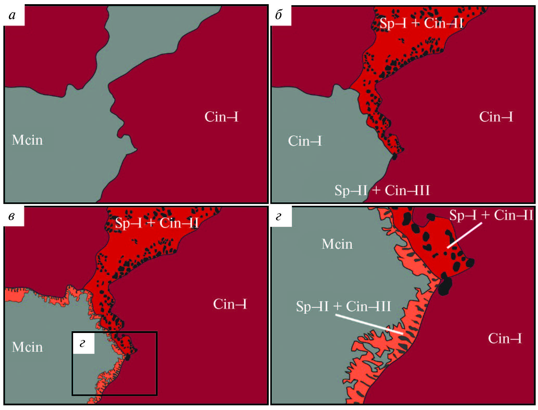 Fig. 6. Stages of the internal structure formation of cinnabar from Izvyostka River placer. Cin — cinnabar, Mcin — metacinnabar, Sp — sphalerite, Py — pyrite.