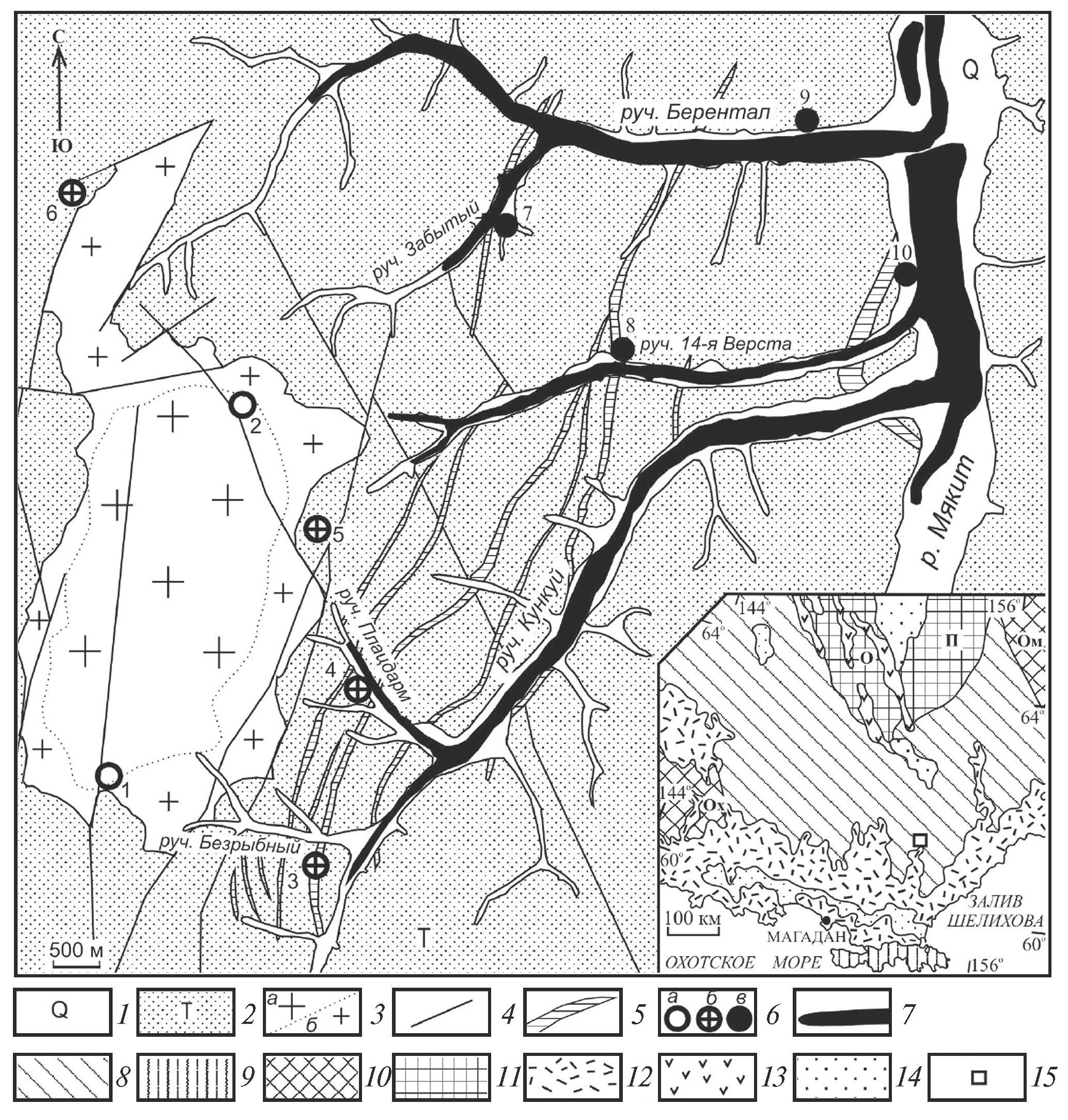 1 — четвертичные аллювиальные отложения речных долин; 2 — триасовые терригенные и вул-каногенно-терригенные отложения Балыгычанского поднятия Яно-Колымской складчатой системы; 3 — позднеюрско-раннемеловые среднезернистые (а) и мелкозернистые (б) биотитовые граниты Берентальского штока; 4 — разрывные нарушения; 5 — минерализованные зоны дробления с прожилково-жильным окварцеванием и вкрапленно-прожилковой рудной минерализацией; 6 — золоторудные проявления, связанные с Берентальским гранитным интрузивом: а — с висмут-сульфотеллуридным (1 — Фронт, 2 — Берентал), б — сульфидно-сульфоарсенидным (3 — Зона Южная, 4 — Плацдарм, 5 — Палатка, 6 — Зона Тревога), в — серебро-полисульфидным (7 — Забытый, 8 — 14-я Верста, 9 — Нижне-Берентальское; 10 — Террасовое) минеральными типами оруденения; 7 — россыпи золота; 8—15 — обозначения геологических структур на врезке: 8, 9 — Верхояно-Чукотская (8) и Корякско-Камчатская (9) складчатые области; 10 — Охотский (Ох) и Омолонский (Ом) срединные массивы; 11 — Омулевское (О) и Приколымское (П) поднятия; 12, 13 — Охотско-Чукотский (12) и Уяндино-Ясачненский (13) вулканогенные пояса; 14 — наложенные кайнозойские впадины; 15 — местоположение Нижне-Мякитского рудного узла