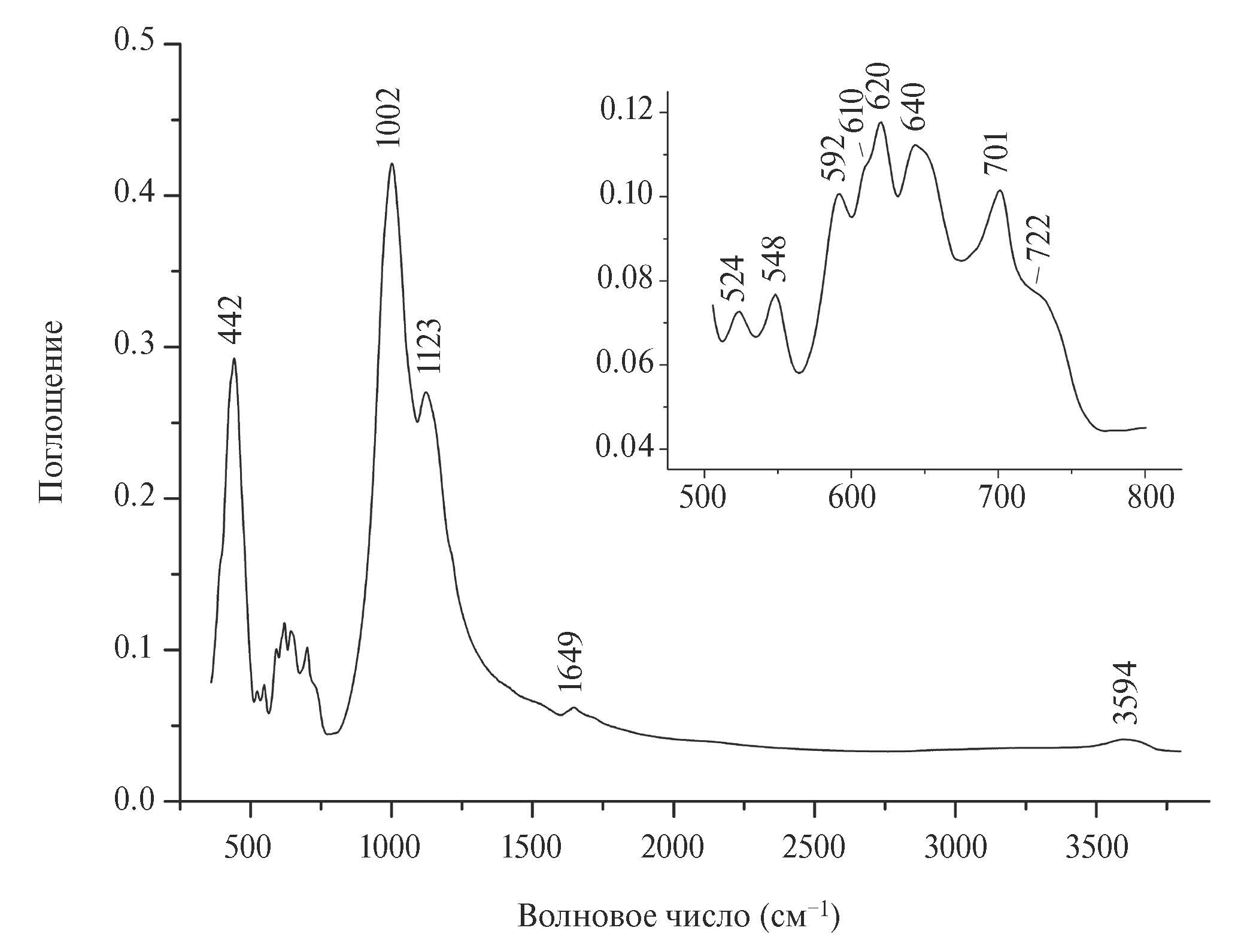 Рис. 1. Инфракрасный спектр поглощения низконатриевого сакрофанита. На вставке показана «область отпечатков пальцев».