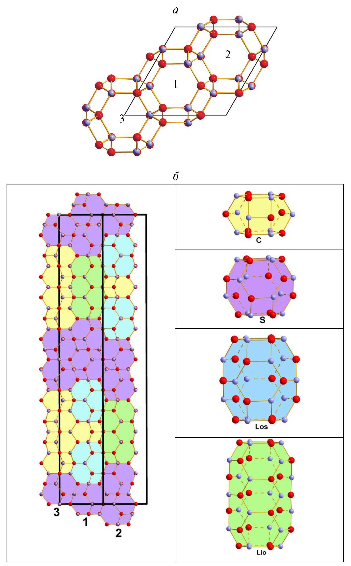 Рис. 2. Расположение колонок в структуре низконатриевого сакрофанита — вид вдоль (а) и перпендикулярно (б, слева) оси с, а также различные виды полостей, составляющие колонки: С — канкринитовая, S — содалитовая, Los — лосодовая и Lio — лиоттитовая полости (б, справа).