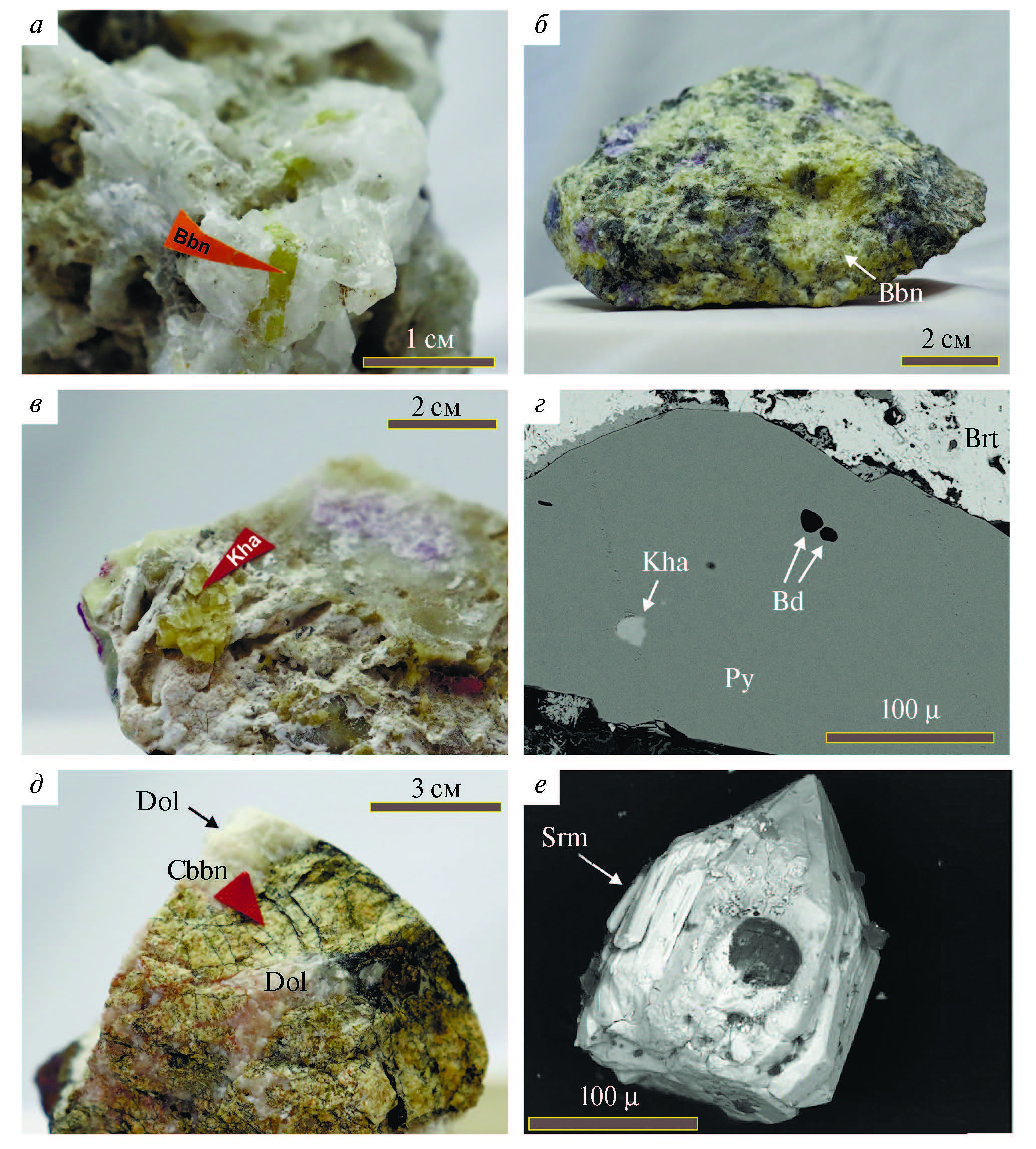 (а) — образец бурбанкита ГИМ 6356/1; (б) — образец бурбанкита ГИМ 6543/2; (в) — образец ханнешита ГИМ 7772; (г) — образец ханнешита Sal50—180.5—2; (д) — образец кальциобурбанкита ГИМ 7545/1; (е) — образец санроманита FN1090. (a), (б), (в) и (д) — оптические фотографии, (г) и (е) — изображение в обратно-рассеянных электронах (BSE). Brt — барит, Bd — бредлеит, Bbn — бурбанкит, Dol — доломит, Pct — пектолит, Py — пирит, Cbbn — кальциобурбанкит, Srm — санроманит, Kha — ханнешит.