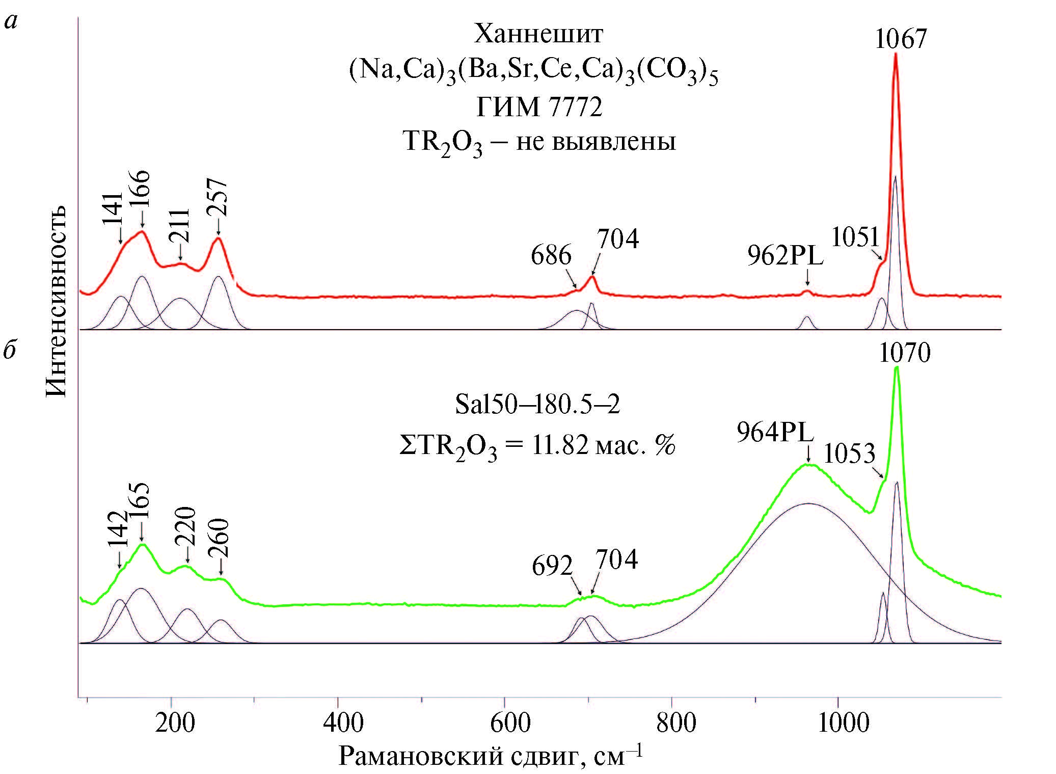 Несмотря на то, что в настоящее время накоплен значительный объем экспериментальных данных по фотолюминесцентным спектрам минералов (MacRae, Wilson, 2008), определение фотолюминесцентных полос в рамановских спектрах, как это было продемонстрировано на примере циркона (Nasdala, Hanchar, 2004), может быть непростой задачей. Для минералов группы бурбанкита она была решена путем сравнения спектров образцов с разным содержанием РЗЭ, что позволило найти «лишние» полосы, не являющиеся колебательными.