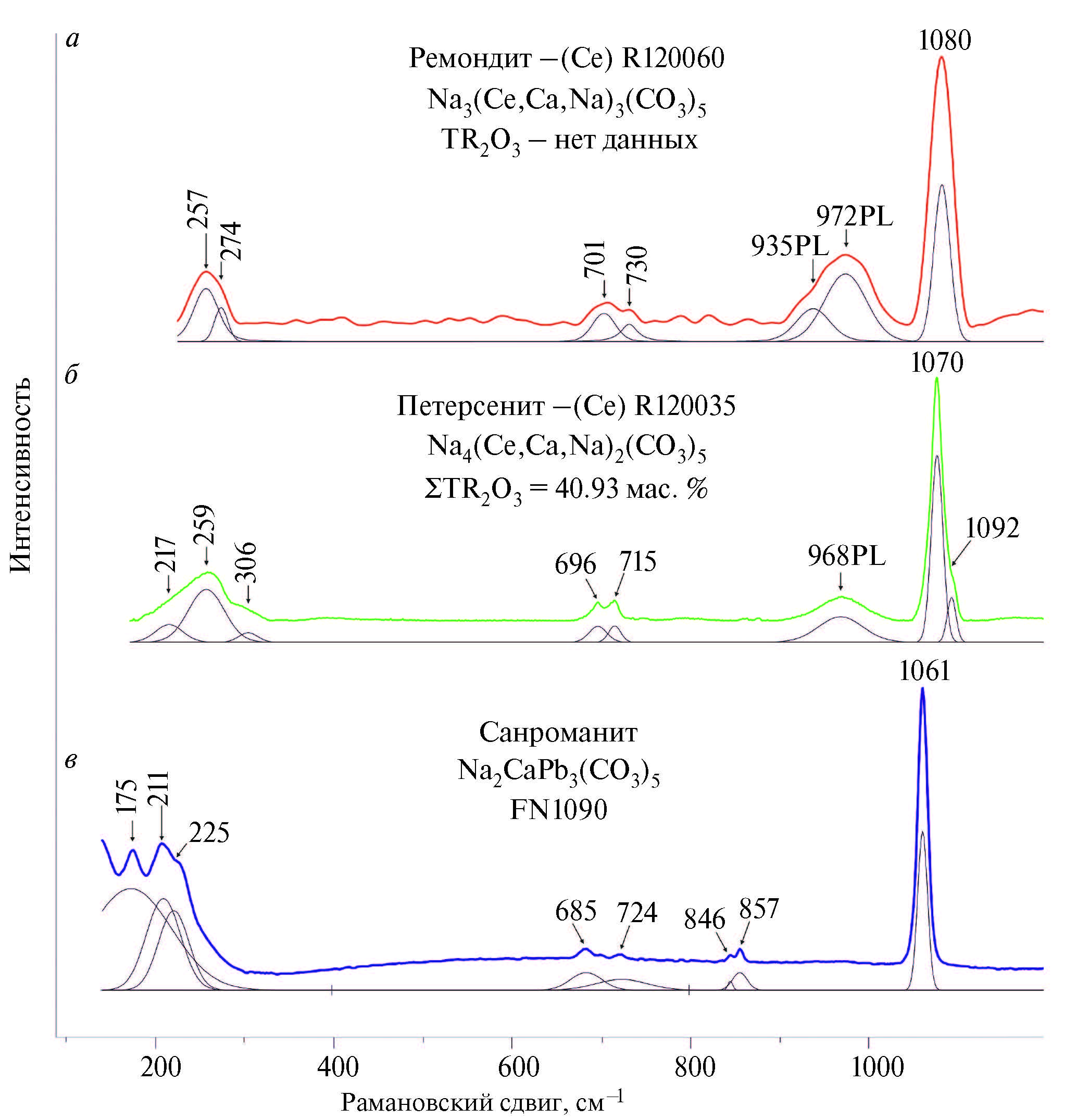 а — burbankite (GIM 6543/2); б — burbankite (GIM 6356); в — calcioburbankite (GIM 7545/1). Here and further in Fig. 3 and 4 black curves under the spectra are Gaussian functions for finding the peaks of the vibrational bands. PL — photoluminescent bands.
