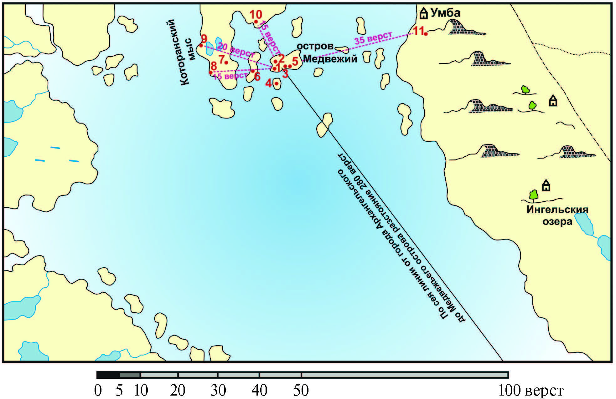 1. Первая и вторая шахты, в которых добывались натуральное серебро и серебряная руда, находились и «простирание свое имели с вельми добрым признаком» (обе шахты расположены на Медвежьем острове. Первую Мусин-Пушкин ошибочно называет «Надежда рудник», в действительности согласно планам, составленным Конрадом де Травесом, эта шахта «Двухглавый Орeл» 3с 5 штольнями 4 и глубиной 15 сажен. Вторую Мусин-Пушкин называет «Щастие», в действительности это шахта «Надежда» глубиной 4 сажени; расстояние между шахтами 10 сажен; обе шахты вскрывали одну и ту же рудную жилу на берегу моря, кроме самородного серебра добывалась «глянцовая серебряная руда» — минерал серебряный блеск или аргентит (Ag2S); согласно В. М. Севергину, «глянцовая или стекловатая руда» — это обычная серебряная руда Медвежьего острова (Севергин, 1798; С. 81). — М.П.). 2. Третия шахта — «в ней признак простирания с доброю надеждою» (это первая и самая знаменитая шахта Медвежьего острова — «Дай Бог Счастья», еe глубина 30 сажен, и в ней пройдено 6 штолен. У Мусина-Пушкина названа «Орел». Здесь также добывались самородное серебро и аргентит. — М.П.). 3. Шурф — «в нем значивался доброй признак и чего доказывалось, что та жила с первою согласна, но лежит во вне острова» (в жиле самородное серебро и «блейчглянцовая руда» — блeклый блеск, или блeклая руда, также является обычной серебряной рудой Медвежьего острова (Севергин, 1798; С. 87). — М.П.). 4. «Признак серебряной руды, которой тогда еще был не разведан за зимним временем» (жила расположена на острове Малый Седловатый, руда «блейчглянцовая». — М.П.). 5. «Рудоискателями найдено натуральное серебро в 3-х шестах 5 от номера 3, не работано за зимним же временем» (жила расположена на Медвежьем острове. — М.П.). Окало оных лежащия признаки». 6. «На Хедо острове разстоянием от Медвежье острова в 1½ версты» (шахта с двумя штольнями глубиной 10 сажен, руда «блейчглянцовая». — М.П.). 7. На прямом грунте в урочище Пердуниха (шурф на жиле с «глянцовой рудой». — М.П.). 8. На Которанском наволоке» (шурф на жиле с «глянцовой рудой». — М.П.). 9. «В Кандалашском заливе на Которанском его наволоке» (шурф на жиле с «глянцовой рудой». — М.П.). 10. На Еханданском мысу (шахта глубиной 10 сажень на жиле с «блейчглянцовой рудой», собственного названия не имеет. — М.П.). 11. «Близь Умбской обсерватории от Медвежьяго острова в 30 верстах» (на Ройменском наволоке шурф глубиной 1½ сажени, пройденный по жиле содержащей «блейчглянцовую руду смешанною с светлокрасною серебряной рудою»; светло-красная серебряная руда — прустит (Ag3AsS3), обычная руда Медвежьего острова (Севергин, 1798; С. 87). — М.П.)»