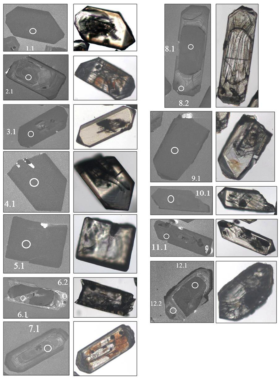 Наиболее представительные кристаллы, отобранные вручную под микроскопом, были имплантированы в безсвинцовую эпоксидную смолу (шайба диаметром 2.5 см) вместе с зернами международных цирконовых стандартов TEMORA и 91500. Затем кристаллы сошлифовывались на половину своей толщины и полировались. На препарат наносилось токопроводящее золотое покрытие в установке катодно-вакуумного распыления в течение одной минуты при силе тока 20 mA. В дальнейшем зерна цирконов документировались в проходящем и отраженном свете, а также c использованием сканирующего электронного микроскопа CamScan МХ2500 с системой CLI/QUA2 для получения катодолюминесцентных (CL) и в обратно-отраженных электронах (BSE) изображений, характеризующих внутреннее зонально-секториальное строение кристаллов циркона. Рабочее расстояние составляло 25—28 мм, ускоряющее напряжение — 20 кВ, ток практически полностью сфокусированного пучка на цилиндре Фарадея — 4—6 нА.
