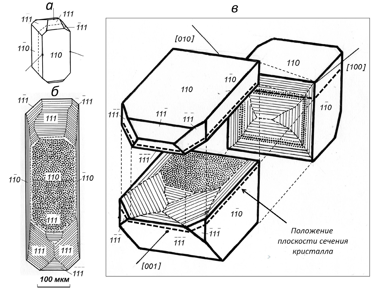 Рис. 3. Морфология и внутреннее строение одного из изученных кристаллов циркона (рис. 2, кристалл с точками пробоотбора 8.1, 8.2): а — общий вид (пунктирной линией показана плоскость среза); б — зональность и секториальность на срезе кристалла; в — объемная модель зонально-секториального строения.