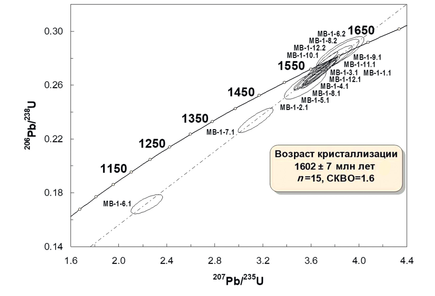Параметры линейной (СКВО = 1.6) зависимости в координатах 206Pb/238U –207Pb/235U по всей совокупности (n = 15) аналитических данных устанавливают возраст кристаллов циркона по верхнему пересечению изохроны с конкордией в 1602 ± 7 млн лет (рис. 4). Мы полагаем, что средневзвешенное значение возраста кристаллизации циркона по отношению 207Pb/206Pb, рассчитанное только по конкордантным и субконкордантным результатам — 1595 ± 5 млн лет (рис. 5), более адекватно и должно рассматриваться как время кристаллизации циркона и, соответственно, возраст породы-носителя составляет около 1595 млн лет.