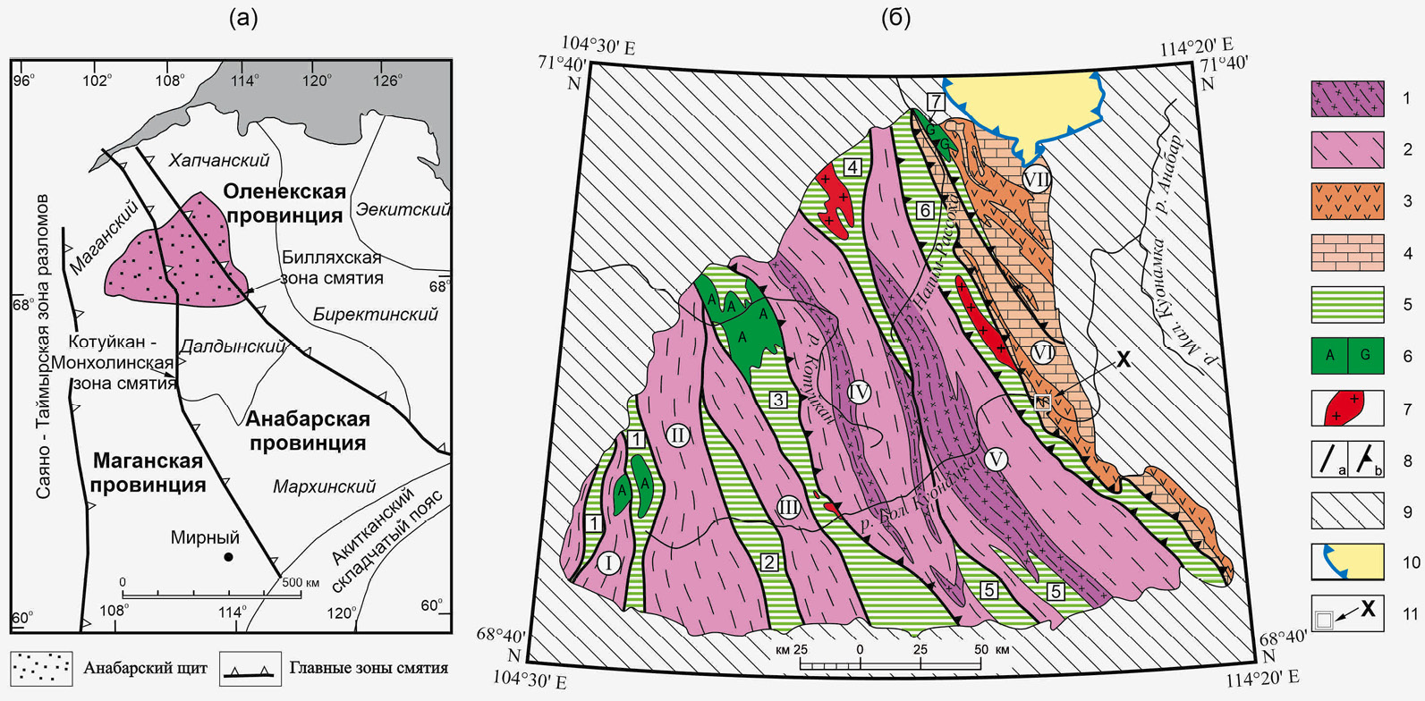 В пределах Анабарского щита обнажаются террейны трех тектонических провинций (рис. 1, а): Маганской тоналит-трондьемит-гнейсовой на западе, Анабарской гранулит-ортогнейсовой в средней части и Хапчанской гранулит-парагнейсовой на востоке щита (Rosen, Turkina, 2007). Шовные зоны между провинциями представлены на западе Анабарского щита — Котуйкан-Монхолинской, на востоке — Салтах-Билляхской сутурами. Вдоль Салтах-Билляхской сутуры контактируют архейские гранулиты Джелиндинской глыбы и гранулиты палеопротерозойского Хапчанского орогенного пояса (Розен и др., 2006).