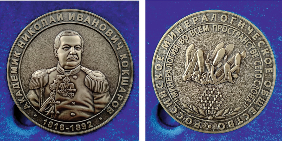 В 2024 году прошло первое награждение лауреатов премии им. Н. И. Кокшарова Российского минералогического общества (РМО). Медаль присуждается за выдающиеся заслуги в области минералогии «во всем пространстве сего слова», включая научные труды, открытия и изобретения, и является высшей наградой РМО (рис. 1). Ежегодно лауреатами медали могут стать один российский и один иностранный номинанты.