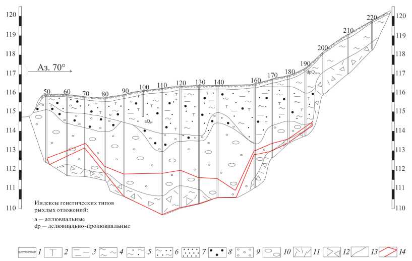 1 – soil-vegetative layer, 2 – peat, 3 – silt, 4 – clay, 5 – loam, 6 – sandy loam, 7 – sand, 8 – gravel, 9 – pebbles, 10 – boulders, 11 – gruss, 12 – crushed stone, 13 – boundaries of genetic types of loose sediments, 14 – productive layer.