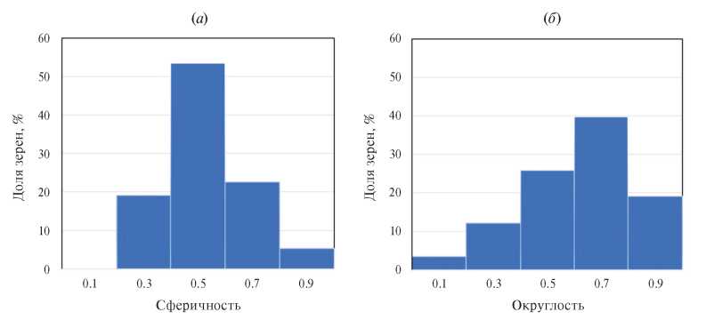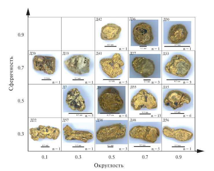 По морфологии зерна самородного золота были подразделены на каплевидно-округлые, комковатые, уплощенно-комковатые и пластинчатые разновидности; определены их основные морфометрические параметры (длина, ширина и толщина, коэффициент уплощенности, коэффициент удлиненности, средний размер, гидравлическая крупность), среднестатистические характеристики химического состава. Показано морфологическое разнообразие зерен золота в координатах сферичность – округлость. Наибольшим распространением обладают средневытянутые зерна (с коэффициентом сферичности 0.5), которые при этом слабо-, средне-, хорошо- или сильноокатаны (с коэффициентом округлости соответственно 0.3, 0.5, 0.7 и 0.9).