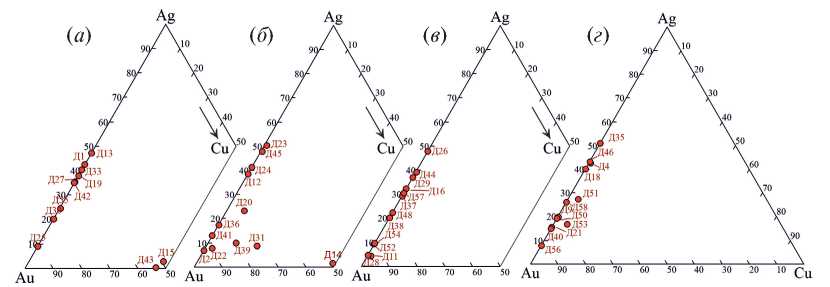 5 | Д53, рис. 6, г | Самородное золото | 88.00 | 10.41 | 1.85 | 100.26 | 878 | 11 | –0.45 |