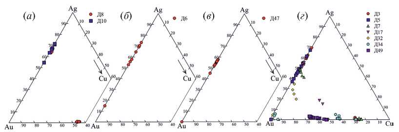 Первая находка самородного золота (размером около 20 микрон в поперечнике) из дунитов Гулинского массива охарактеризована в работе (Когарко, Сенин, 2011). Анализ состава золотой минерализации и минералов-узников в россыпном золоте Гулинского массива позволил сделать вывод о длительном процессе формирования золотого оруденения массива (Сазонов и др., 2001; Малич и др., 2013; Рябчиков и др., 2016) – от высокотемпературной магматической (перовскит, бадделеит и др.) до низкотемпературной гидротермальной стадии (галенит, гематит, хлорит и др.). Верхний температурный предел постмагматического рудообразования определялся формированием тетрааурикуприда (менее 410 ˚С, Okamoto et al., 1987). Однако для тетрааурикуприда и аурикуприда в составе гетерогенных зерен золота (обр. Д7 и Д8) из россыпи р. Дунитовой (рис. 10) можно предположить еще более низкотемпературные условия образования.